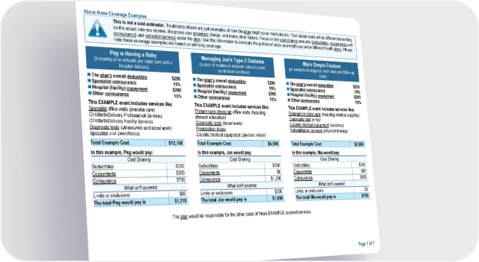 About these Coverage Examples: This is not a cost estimator. Treatments shown are just examples of how this plan might cover medical care. Your actual costs will be different depending on the actual care you receive, the prices your providers charge, and many other factors. Focus on the cost sharing amounts (deductibles, copayments and coinsurance) and excluded services under the plan. Use this information to compare the portion of costs you might pay under different health plans. Please note these coverage examples are based on self-only coverage. Peg is Having a Baby Managing Joe's Type 2 Diabetes Mia's Simple Fracture (9 months of in-network pre-natal care and a (a year of routine in-network care of a well- (in-network emergency room visit and follow up hospital delivery) controlled condition) care) The plan's overall deductible $250 The plan's overall deductible $250 The plan's overall deductible $250 Specialist coinsurance 15% Specialist coinsurance 15% Specialist coinsurance 15% Hospital (facility) copayment $200 Hospital (facility) copayment $200 Hospital (facility) copayment $200 Other coinsurance 15% Other coinsurance 15% Other coinsurance 15% This EXAMPLE event includes services like: This EXAMPLE event includes services like: This EXAMPLE event includes services like: Specialist office visits (prenatal care) Primary care physician office visits (including Emergency room care (including medical supplies) Childbirth/Delivery Professional Services disease education) Diagnostic test (x-ray) Childbirth/Delivery Facility Services Diagnostic tests (blood work) Durable medical equipment (crutches) Diagnostic tests (ultrasounds and blood work) Prescription drugs Rehabilitation services (physical therapy) Specialist visit (anesthesia) Durable medical equipment (glucose meter) Total Example Cost $12,700 Total Example Cost $5,600 Total Example Cost $2,800 In this example, Peg would pay: In this example, Joe would pay: In this example, Mia would pay: Cost Sharing Cost Sharing Cost Sharing Deductibles $250 Deductibles $250 Deductibles $250 Copayments $200 Copayments $0 Copayments $80 Coinsurance $700 Coinsurance $1,200 Coinsurance $400 What isn't covered What isn't covered What isn't covered Limits or exclusions $60 Limits or exclusions $200 Limits or exclusions $0 The total Peg would pay is $1,210 The total Joe would pay is $1,650 The total Mia would pay is $730 The plan would be responsible for the other costs of these EXAMPLE covered services. Page 7 of 7