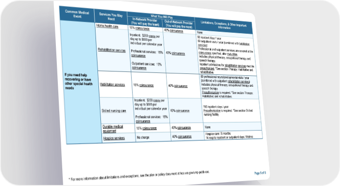 Common Medical Services You May What You Will Pay Limitations, Exceptions, & Other Important Event Need In-Network Provider Out-of-Network Provider Information (You will pay the least) (You will pay the most) Home health care 15% coinsurance 40% coinsurance None Inpatient: $200 copay per 60 inpatient days / year day up to $600 per 60 outpatient visits / year (combined with habilitation individual per calendar year services) Professional and outpatient services are covered at the Rehabilitation services Professional services: 15% 40% coinsurance coinsurance specified, after deductible. coinsurance Includes physical therapy, occupational therapy and speech therapy. Outpatient services: 15% Inpatient admissions for rehabilitation services must be coinsurance preauthorized. *See section Therapy: Habilitative and rehabilitative. If you need help 60 professional neurodevelopmental visits / year recovering or have (combined with outpatient rehabilitation services) other special health Habilitation services 15% coinsurance 40% coinsurance Includes physical therapy, occupational therapy and needs speech therapy. Preauthorization is required. *See section Therapy: Habilitative and rehabilitative. Inpatient: $200 copay per day up to $600 per 150 inpatient days / year Skilled nursing care individual per calendar year 40% coinsurance Preauthorization is required. *See section Skilled Professional services: 15% nursing facility. coinsurance Durable medical 15% coinsurance 40% coinsurance None equipment Hospice services No charge 40% coinsurance Hospice care / 6 months 14 respite inpatient or outpatient days / lifetime * For more information about limitations and exceptions, see the plan or policy document at hca.wa.gov/ump-pebb-coc. Page 5 of 8