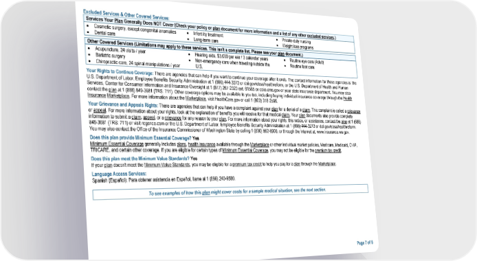Excluded Services & Other Covered Services: Services Your Plan Generally Does NOT Cover (Check your policy or plan document for more information and a list of any other excluded services.) • Cosmetic surgery, except congenital anomalies • Infertility treatment • Private-duty nursing • Dental care • Long-term care • Weight loss programs Other Covered Services (Limitations may apply to these services. This isn't a complete list. Please see your plan document.) • Acupuncture, 24 visits / year • Hearing aids, $3,000 per ear / 3 calendar years • Routine eye care (Adult) • Bariatric surgery • Non-emergency care when traveling outside the • Routine foot care • Chiropractic care, 24 spinal manipulations / year U.S. Your Rights to Continue Coverage: There are agencies that can help if you want to continue your coverage after it ends. The contact information for those agencies is: the U.S. Department of Labor, Employee Benefits Security Administration at 1 (866) 444-3272 or dol.gov/ebsa/healthreform, or the U.S. Department of Health and Human Services, Center for Consumer Information and Insurance Oversight at 1 (877) 267-2323 ext. 61565 or cciio.cms.gov or your state insurance department. You may also contact the plan at 1 (888) 849-3681 (TRS: 711). Other coverage options may be available to you too, including buying individual insurance coverage through the Health Insurance Marketplace. For more information about the Marketplace, visit HealthCare.gov or call 1 (800) 318-2596. Your Grievance and Appeals Rights: There are agencies that can help if you have a complaint against your plan for a denial of a claim. This complaint is called a grievance or appeal. For more information about your rights, look at the explanation of benefits you will receive for that medical claim. Your plan documents also provide complete information to submit a claim, appeal, or a grievance for any reason to your plan. For more information about your rights, this notice, or assistance, contact the plan at 1 (888) 849-3681 (TRS: 711) or visit regence.com or the U.S. Department of Labor, Employee Benefits Security Administration at 1 (866) 444-3272 or dol.gov/ebsa/healthreform. You may also contact the Office of the Insurance Commissioner of Washington State by calling 1 (800) 562-6900, or through the Internet at: www.insurance.wa.gov. Does this plan provide Minimum Essential Coverage? Yes Minimum Essential Coverage generally includes plans, health insurance available through the Marketplace or other individual market policies, Medicare, Medicaid, CHIP, TRICARE, and certain other coverage. If you are eligible for certain types of Minimum Essential Coverage, you may not be eligible for the premium tax credit. Does this plan meet the Minimum Value Standards? Yes If your plan doesn't meet the Minimum Value Standards, you may be eligible for a premium tax credit to help you pay for a plan through the Marketplace. Language Access Services: Spanish (Español): Para obtener asistencia en Español, llame al 1 (866) 240-9580. To see examples of how this plan might cover costs for a sample medical situation, see the next section. Page 7 of 8