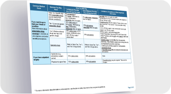 Common Medical Services You May What You Will Pay Limitations, Exceptions, & Other Important Event Need In-Network Provider Out-of-Network Provider Information (You will pay the least) (You will pay the most) Value Tier (Specific high 5% coinsurance or Deductible does not apply for insulin. value prescription drugs $10 copay, whichever is 5% coinsurance, deductible *Coinsurance for Tier 2 covered insulins are capped at used to treat certain less / prescription, does not apply $35 per 30-day supply. chronic conditions) deductible does not apply Preauthorization may be required. Please refer to your If you need drugs to 10% coinsurance or plan document. *See section Your prescription drug treat your illness or Tier 1 (Low-cost generic $25 copay, whichever is 10% coinsurance, benefit. condition prescription drugs) less / prescription, deductible does not apply Up to a 90-day supply / retail prescription (your cost More information about deductible does not apply share is per 30-day supply) prescription drug Tier 2 (Preferred brand 30% coinsurance or $75 90-day supply / mail-order prescription drugs and high-cost copay, whichever is less, 30% coinsurance Postal Prescription Services (PPS) and Costco Mail coverage is available at generic drugs) up to 30 day supply / Order Pharmacy are the plan's only network mail-order ump.regence.com/pebb/ prescription* pharmacies. benefits/prescriptions Specialty drugs must be filled from the specialty pharmacy, Ardon Health, except when a drug can only Refer to Value Tier, Tier 1, Refer to Value Tier, Tier 1, be dispensed by a certain pharmacy. Specialty drugs and Tier 2 drugs above. and Tier 2 drugs above. Covers up to a 30-day supply for most specialty prescription drugs. Prescription drugs filled at excluded pharmacies are not covered. Facility fee (e.g., If you have outpatient ambulatory surgery 15% coinsurance 40% coinsurance None surgery center) Physician/surgeon fees 15% coinsurance 40% coinsurance Preauthorization may be required. *See section Surgery. * For more information about limitations and exceptions, see the plan or policy document at hca.wa.gov/ump-pebb-coc. Page 3 of 8