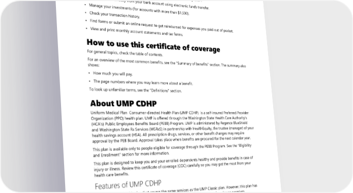 • Review prescription drug policies and programs. Visit the HealthEquity website to: • Sign in to your personal member portal. • Check your health savings account (HSA) balance. • View and pay a provider’s claim that has already been processed by UMP. • Make deposits directly from your bank account using electronic funds transfer. • Manage your investments (for accounts with more than $1,500). • Check your transaction history. • Find forms or submit an online request to get reimbursed for expenses you paid out of pocket. • View and print monthly account statements and tax forms. How to use this certificate of coverage For general topics, check the table of contents. For an overview of the most common benefits, see the “Summary of benefits” section. The summary also shows: • How much you will pay. • The page numbers where you may learn more about a benefit. To look up unfamiliar terms, see the “Definitions” section. About UMP CDHP Uniform Medical Plan Consumer-directed Health Plan (UMP CDHP) is a self-insured Preferred Provider Organization (PPO) health plan. UMP is offered through the Washington State Health Care Authority’s (HCA’s) Public Employees Benefits Board (PEBB) Program. UMP is administered by Regence BlueShield and Washington State Rx Services (WSRxS) in partnership with HealthEquity, the trustee (manager) of your health savings account (HSA). All prescription drugs, services, or other benefit changes may require approval by the PEB Board. Approval takes place when benefits are procured for the next calendar year. This plan is available only to people eligible for coverage through the PEBB Program. See the “Eligibility and Enrollment” section for more information. This plan is designed to keep you and your enrolled dependents healthy and provide benefits in case of injury or illness. Review this certificate of coverage (COC) carefully so you may get the most from your health care benefits. Features of UMP CDHP UMP CDHP is a health plan that covers the same services as the UMP Classic plan. However, this plan has a different payment structure and a higher deductible for covered services for a lower premium. This plan has one combined deductible for medical services and prescription drugs. If you have one or more dependents enrolled in your plan, you must pay the total combined family deductible before the plan pays for services, including prescription drugs. Certain covered preventive care services and covered insulins are not subject to your deductible, which means the plan will pay for some services before you meet your deductible. See the “Deductible” section under “What you pay for services” for more information. 14 2024 UMP CDHP (PEBB) Certificate of Coverage