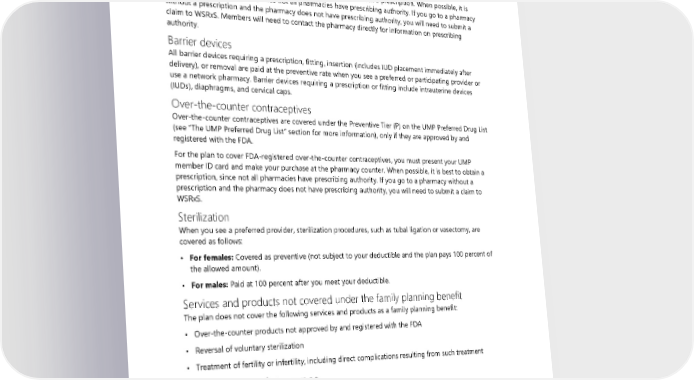 implants, injectables, condoms, and spermicides. Final determination of medical necessity for FDA approved contraceptives is determined by the prescribing provider. Quantity limits still apply. You may purchase up to a 12-month supply of contraceptives. Contact Washington State Rx Services (WSRxS) Customer Service for information on how to obtain a 12-month supply. The replacement of lost, expired, or stolen contraceptives is not covered. You may obtain emergency contraception over-the-counter without a prescription. When possible, it is best to obtain a prescription, since not all pharmacies have prescribing authority. If you go to a pharmacy without a prescription and the pharmacy does not have prescribing authority, you will need to submit a claim to WSRxS. Members will need to contact the pharmacy directly for information on prescribing authority. Barrier devices All barrier devices requiring a prescription, fitting, insertion (includes IUD placement immediately after delivery), or removal are paid at the preventive rate when you see a preferred or participating provider or use a network pharmacy. Barrier devices requiring a prescription or fitting include intrauterine devices (IUDs), diaphragms, and cervical caps. Over-the-counter contraceptives Over-the-counter contraceptives are covered under the Preventive Tier (P) on the UMP Preferred Drug List (see “The UMP Preferred Drug List” section for more information), only if they are approved by and registered with the FDA. For the plan to cover FDA-registered over-the-counter contraceptives, you must present your UMP member ID card and make your purchase at the pharmacy counter. When possible, it is best to obtain a prescription, since not all pharmacies have prescribing authority. If you go to a pharmacy without a prescription and the pharmacy does not have prescribing authority, you will need to submit a claim to WSRxS. Sterilization When you see a preferred provider, sterilization procedures, such as tubal ligation or vasectomy, are covered as follows: • For females: Covered as preventive (not subject to your deductible and the plan pays 100 percent of the allowed amount). • For males: Paid at 100 percent after you meet your deductible. Services and products not covered under the family planning benefit The plan does not cover the following services and products as a family planning benefit: • Over-the-counter products not approved by and registered with the FDA • Reversal of voluntary sterilization • Treatment of fertility or infertility, including direct complications resulting from such treatment Foot care, maintenance Maintenance foot care includes services such as toenail trimming and corn or callous removal or trimming. These services are covered only for a diagnosis of diabetes and when provided by an approved provider type. The plan does not cover maintenance foot care provided outside the diagnosis of diabetes. Gender affirming care With a diagnosis of gender dysphoria, the following services are covered at the standard rate for outpatient services and at the inpatient rate for inpatient services: 52 2024 UMP CDHP (PEBB) Certificate of Coverage