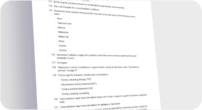 111. Spinal cord stimulation for chronic neuropathic pain 112. Spinal injections, therapeutic (except as described under “Spinal injections” on page 70) of the following types: ◦ Facet injections ◦ Intradiscal injections ◦ Medial branch nerve block injections 113. Spinal surgical procedures known as vertebroplasty, kyphoplasty, and sacroplasty 114. Stem cell therapies for musculoskeletal conditions 115. Stereotactic body radiation therapy for the treatment of primary tumor of the following cancer types: ◦ Bone ◦ Head and neck ◦ Adrenal ◦ Melanoma ◦ Merkel cell ◦ Breast ◦ Ovarian ◦ Cervical 116. Stereotactic radiation surgery for conditions other than central nervous system primary and metastatic tumors 117. Surrogacy 118. Telephone or virtual consultations or appointments, except as described under “Telemedicine services” on page 77 119. Tinnitus specific therapies including, but not limited to: ◦ Tinnitus retraining therapy (TRT) ◦ Neuromonics tinnitus treatment (NTT) ◦ Tinnitus activities treatment (TAT) ◦ Tinnitus-masking counseling 120. Transcutaneous vagal nerve stimulation (does not include or apply to support of previous implanted VNS) 121. Transcutaneous vagal nerve stimulation for epilepsy or depression 122. Travel, transportation, and lodging expenses, except as specified for ambulance services covered by the plan (see page 39), or approved travel and lodging costs related to the COE Program for single knee and single hip replacement (see page 58) and for spine care (see page 70) 123. Treatment of varicose veins with Endovenous Laser Ablation (EVLA), Radiofrequency Ablation (RFA), Sclerotherapy, and Phlebectomy in patients with pregnancy, active infection, peripheral arterial disease, or deep vein thrombosis (DVT) 114 2024 UMP CDHP (PEBB) Certificate of Coverage