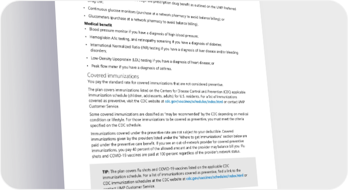 Preventive care for specified chronic conditions UMP covers services and supplies when prescribed to prevent the worsening of a diagnosed chronic condition or the development of a secondary condition. You pay coinsurance, but these services or supplies are not subject to any applicable deductible when received from a preferred or participating provider. Prescription drug benefit • Certain medications covered through the prescription drug benefit as outlined on the UMP Preferred Drug List; • Continuous glucose monitors (purchase at a network pharmacy to avoid balance billing); or • Glucometers (purchase at a network pharmacy to avoid balance billing). Medical benefit • Blood pressure monitor if you have a diagnosis of high blood pressure; • Hemoglobin A1c testing, and retinopathy screening if you have a diagnosis of diabetes; • International Normalized Ratio (INR) testing if you have a diagnosis of liver disease and/or bleeding disorders; • Low-Density Lipoprotein (LDL) testing if you have a diagnosis of heart disease; or • Peak flow meter if you have a diagnosis of asthma. Covered immunizations You pay the standard rate for covered immunizations that are not considered preventive. The plan covers immunizations listed on the Centers for Disease Control and Prevention (CDC) applicable immunization schedule (children, adolescents, adults) for U.S. residents. For a list of immunizations covered as preventive, visit the CDC website at cdc.gov/vaccines/schedules/index.html or contact UMP Customer Service. Some covered immunizations are classified as “may be recommended” by the CDC depending on medical condition or lifestyle. For those immunizations to be covered as preventive, you must meet the criteria specified on the CDC schedule. Immunizations covered under the preventive rate are not subject to your deductible. Covered immunizations given by the providers listed under the “Where to get immunizations” section below are paid under the preventive care benefit. If you see an out-of-network provider for covered preventive immunizations, you pay 40 percent of the allowed amount and the provider may balance bill you. Flu shots and COVID-19 vaccines are paid at 100 percent regardless of the provider’s network status. TIP: The plan covers flu shots and COVID-19 vaccines listed on the applicable CDC immunization schedule. For a list of immunizations covered as preventive, find a link to the CDC immunization schedules at the CDC website at cdc.gov/vaccines/schedules/index.html or contact UMP Customer Service. Where to get immunizations You pay $0 for immunizations covered under the preventive care benefit when received from a: • Preferred or participating provider. 2024 UMP CDHP (PEBB) Certificate of Coverage 67