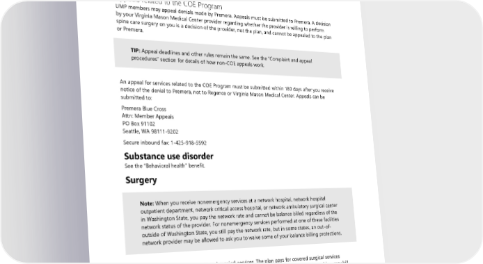 What happens if you are not an appropriate candidate for spine care surgery under the COC Program If Virginia Mason Medical Center determines you are not an appropriate candidate for spine care surgery, you may still receive spine care surgery through other providers under this plan. Services received outside the COE Program are processed according to the plan’s medical policies, benefit structure, and the network status of your provider. Appeals related to the COE Program UMP members may appeal denials made by Premera. Appeals must be submitted to Premera. A decision by your Virginia Mason Medical Center provider regarding whether the provider is willing to perform spine care surgery on you is a decision of the provider, not the plan, and cannot be appealed to the plan or Premera. TIP: Appeal deadlines and other rules remain the same. See the “Complaint and appeal procedures” section for details of how non-COE appeals work. An appeal for services related to the COE Program must be submitted within 180 days after you receive notice of the denial to Premera, not to Regence or Virginia Mason Medical Center. Appeals can be submitted to: Premera Blue Cross Attn: Member Appeals PO Box 91102 Seattle, WA 98111-9202 Secure inbound fax: 1-425-918-5592 Substance use disorder See the “Behavioral health” benefit. Surgery Note: When you receive nonemergency services at a network hospital, network hospital outpatient department, network critical access hospital, or network ambulatory surgical center in Washington State, you pay the network rate and cannot be balance billed regardless of the network status of the provider. For nonemergency services performed at one of these facilities outside of Washington State, you still pay the network rate, but in some states, an out-of- network provider may be allowed to ask you to waive some of your balance billing protections. You pay the standard rate for covered surgical services. The plan pays for covered surgical services according to the network status of the provider. The surgeon and other professional providers may bill separately from the facility. Your provider must notify the plan when you are admitted for inpatient treatment and when you receive certain services. Some outpatient procedures require preauthorization. Find the list of services that require preauthorization on the UMP Policies that affect your care webpage. Contact UMP Customer Service if you have questions. See Directory for link and contact information. 2024 UMP CDHP (PEBB) Certificate of Coverage 73