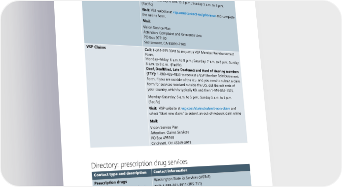 Contact type and description Contact information VSP complaints Call: 1-844-299-3041 Monday–Friday: 6 a.m. to 8 p.m.; Saturday: 7 a.m. to 8 p.m.; Sunday 8 a.m. to 8 p.m. (Pacific) Deaf, DeafBlind, Late Deafened and Hard of Hearing members call (TTY): 1-800-428-4833 Monday–Saturday: 6 a.m. to 5 p.m.; Sunday 5 a.m. to 8 p.m. (Pacific) Visit: VSP website at vsp.com/contact-us/grievance and complete the online form. Mail: Vision Service Plan Attention: Complaint and Grievance Unit PO Box 997100 Sacramento, CA 95899-7100 VSP Claims Call: 1-844-299-3041 to request a VSP Member Reimbursement Form. Monday–Friday: 6 a.m. to 8 p.m.; Saturday: 7 a.m. to 8 p.m.; Sunday 8 a.m. to 8 p.m. (Pacific) Deaf, DeafBlind, Late Deafened and Hard of Hearing members (TTY): 1-800-428-4833 to request a VSP Member Reimbursement Form. If you are outside of the U.S. and you need to submit a claim form for services received outside the U.S. dial the exit code of your country, which is typically 00, and then 1-916-851-1375. Monday–Saturday: 6 a.m. to 5 p.m.; Sunday 5 a.m. to 8 p.m. (Pacific) Visit: VSP website at vsp.com/claims/submit-oon-claim and select “Start new claim” to submit an out-of-network claim online Mail: Vision Service Plan Attention: Claims Services PO Box 495918 Cincinnati, OH 45249-5918 Directory: prescription drug services Contact type and description Contact information Prescription drugs Washington State Rx Services (WSRxS) Contact customer service, locate Call: 1-888-361-1611 (TRS: 711) network pharmacies, ask Monday–Friday: 7:30 a.m. to 5:30 p.m. (Pacific) prescription drug questions, Available outside these hours with limited services. access your WSRxS account, and Visit: Prescription drug coverage webpage at check prescription drug prices ump.regence.com/pebb/benefits/prescriptions Network mail-order pharmacies Costco Mail-Order Pharmacy 2024 UMP CDHP (PEBB) Certificate of Coverage 5