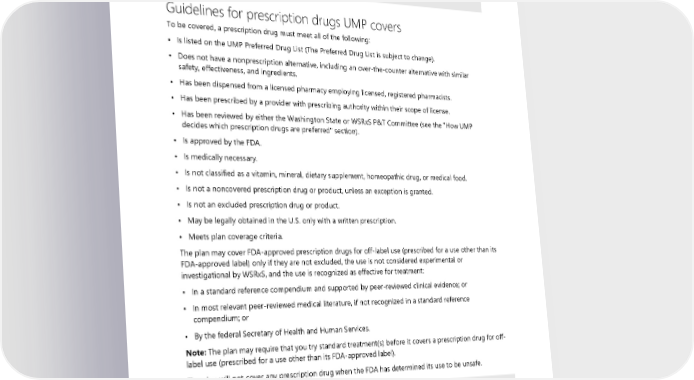 For the plan to cover a prescription drug for you, it must be medically necessary for your health condition. Your provider may prescribe a drug or drug dosage that does not meet the plan’s definition of medically necessary and therefore will not be covered. ALERT! A prescription drug may be noncovered even if no generic equivalent is available. Guidelines for prescription drugs UMP covers To be covered, a prescription drug must meet all of the following: • Is listed on the UMP Preferred Drug List (The Preferred Drug List is subject to change). • Does not have a nonprescription alternative, including an over-the-counter alternative with similar safety, effectiveness, and ingredients. • Has been dispensed from a licensed pharmacy employing licensed, registered pharmacists. • Has been prescribed by a provider with prescribing authority within their scope of license. • Has been reviewed by either the Washington State or WSRxS P&T Committee (see the "How UMP decides which prescription drugs are preferred" section). • Is approved by the FDA. • Is medically necessary. • Is not classified as a vitamin, mineral, dietary supplement, homeopathic drug, or medical food. • Is not a noncovered prescription drug or product, unless an exception is granted. • Is not an excluded prescription drug or product. • May be legally obtained in the U.S. only with a written prescription. • Meets plan coverage criteria. The plan may cover FDA-approved prescription drugs for off-label use (prescribed for a use other than its FDA-approved label) only if they are not excluded, the use is not considered experimental or investigational by WSRxS, and the use is recognized as effective for treatment: • In a standard reference compendium and supported by peer-reviewed clinical evidence; or • In most relevant peer-reviewed medical literature, if not recognized in a standard reference compendium; or • By the federal Secretary of Health and Human Services. Note: The plan may require that you try standard treatment(s) before it covers a prescription drug for off- label use (prescribed for a use other than its FDA-approved label). The plan will not cover any prescription drug when the FDA has determined its use to be unsafe. ALERT! The plan does not cover prescription drugs purchased through mail-order pharmacies located outside the U.S. 90 2024 UMP CDHP (PEBB) Certificate of Coverage