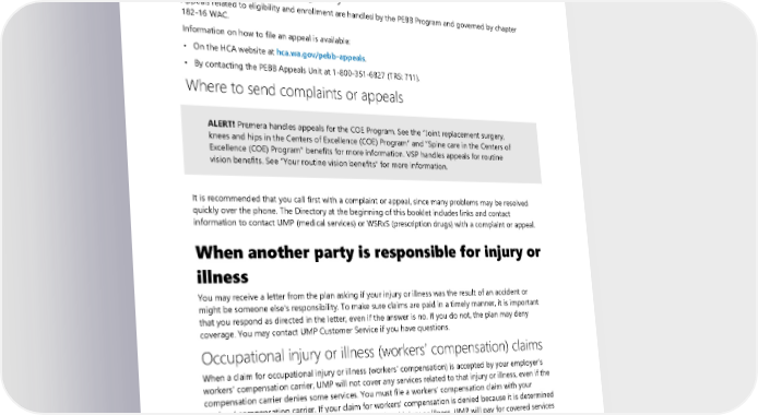 For complaints or concerns about the quality of care you received from any provider: • Call Washington State Department of Health at 360-236-4700 (TRS: 711) or 1-800-562-6900 (TRS: 711). • Email the Department of Health at [email protected]. • Visit the Department of Health website at doh.wa.gov/about-us/file-complaint. Appeals related to eligibility Appeals related to eligibility and enrollment are handled by the PEBB Program and governed by chapter 182-16 WAC. Information on how to file an appeal is available: • On the HCA website at hca.wa.gov/pebb-appeals. • By contacting the PEBB Appeals Unit at 1-800-351-6827 (TRS: 711). Where to send complaints or appeals ALERT! Premera handles appeals for the COE Program. See the “Joint replacement surgery, knees and hips in the Centers of Excellence (COE) Program” and “Spine care in the Centers of Excellence (COE) Program” benefits for more information. VSP handles appeals for routine vision benefits. See “Your routine vision benefits” for more information. It is recommended that you call first with a complaint or appeal, since many problems may be resolved quickly over the phone. The Directory at the beginning of this booklet includes links and contact information to contact UMP (medical services) or WSRxS (prescription drugs) with a complaint or appeal. When another party is responsible for injury or illness You may receive a letter from the plan asking if your injury or illness was the result of an accident or might be someone else’s responsibility. To make sure claims are paid in a timely manner, it is important that you respond as directed in the letter, even if the answer is no. If you do not, the plan may deny coverage. You may contact UMP Customer Service if you have questions. Occupational injury or illness (workers’ compensation) claims When a claim for occupational injury or illness (workers’ compensation) is accepted by your employer’s workers' compensation carrier, UMP will not cover any services related to that injury or illness, even if the compensation carrier denies some services. You must file a workers’ compensation claim with your workers’ compensation carrier. If your claim for workers’ compensation is denied because it is determined the injury or condition is not related to an occupational injury or illness, UMP will pay for covered services under the terms of this COC. Legal rights and responsibilities Coverage under the plan is not provided for medical, dental, prescription, or vision expenses you incur for treatment of an injury or illness if the costs associated with the injury or illness may be covered by another first party insurance or may be recoverable from any of the following: 130 2024 UMP CDHP (PEBB) Certificate of Coverage