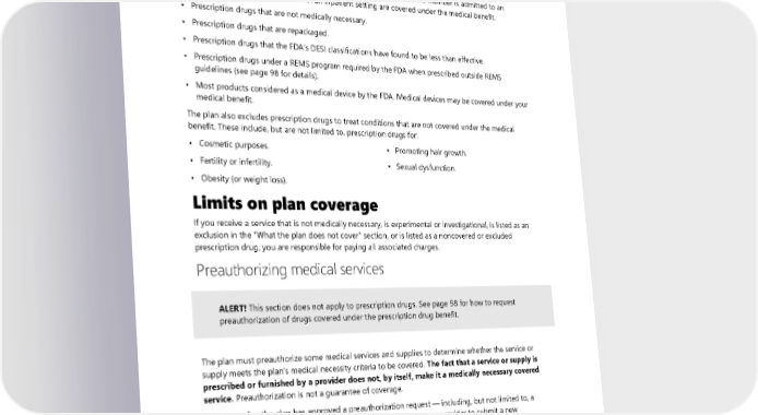 • Over-the-counter products not approved by and registered with the FDA. • Prescription drugs prescribed for excluded conditions. • Prescription drug costs covered by other insurance (see page 121 for coordination with other plans). • Prescription drugs not approved by the FDA. • Prescription drugs provided to a member, in whole or in part, while the member is admitted to an inpatient facility. Drugs provided in an inpatient setting are covered under the medical benefit. • Prescription drugs that are not medically necessary. • Prescription drugs that are repackaged. • Prescription drugs that the FDA’s DESI classifications have found to be less than effective. • Prescription drugs under a REMS program required by the FDA when prescribed outside REMS guidelines (see page 98 for details). • Most products considered as a medical device by the FDA. Medical devices may be covered under your medical benefit. The plan also excludes prescription drugs to treat conditions that are not covered under the medical benefit. These include, but are not limited to, prescription drugs for: • Cosmetic purposes. • Promoting hair growth. • Fertility or infertility. • Sexual dysfunction. • Obesity (or weight loss). Limits on plan coverage If you receive a service that is not medically necessary, is experimental or investigational, is listed as an exclusion in the “What the plan does not cover” section, or is listed as a noncovered or excluded prescription drug, you are responsible for paying all associated charges. Preauthorizing medical services ALERT! This section does not apply to prescription drugs. See page 98 for how to request preauthorization of drugs covered under the prescription drug benefit. The plan must preauthorize some medical services and supplies to determine whether the service or supply meets the plan’s medical necessity criteria to be covered. The fact that a service or supply is prescribed or furnished by a provider does not, by itself, make it a medically necessary covered service. Preauthorization is not a guarantee of coverage. A change after the plan has approved a preauthorization request — including, but not limited to, a change of provider or different/additional services — requires your provider to submit a new preauthorization request and for the plan to approve it. If your preauthorization is denied, your provider may request a peer-to-peer review where they can talk to a Regence BlueShield provider about your condition prior to submitting an appeal. For more information contact UMP customer service. 2024 UMP CDHP (PEBB) Certificate of Coverage 103