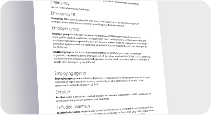 Efficacy Efficacy is the extent to which a specific intervention, procedure, service, supply, or prescription drug produces the desired effect under ideal conditions (in a controlled environment under lab circumstances). Elective contact lenses Elective contact lenses are covered lenses under the frame limit in lieu of coverage for eyeglasses. Emergency See the “Medical emergency” definition. Emergency fill Emergency fill is a process where the plan covers a limited amount of a prescription drug on an emergency basis while the plan processes your drug preauthorization request. Employer group Employer group for the Public Employees Benefits Board (PEBB) Program means those counties, municipalities, political subdivisions, the Washington health benefits exchange, tribal governments, and employee organizations representing state civil service employees obtaining employee benefits through a contractual agreement with the health care authority (HCA) to participate in benefit plans developed by the PEB board. Employer group for the School Employees Benefits Board (SEBB) Program means an employee organization representing school employees and a tribal school as defined in RCW 28A.715.010, obtaining employee benefits through a contractual agreement with the health care authority (HCA) to participate in benefit plans developed by the SEB board. Employing agency Employing agency means a division, department, or separate agency of state government, including an institution of higher education; a county, municipality, or other political subdivision; and a tribal government covered by chapter 41.05 RCW. Enrollee Enrollee means a person who meets all eligibility requirements and is enrolled in PEBB benefits, and for whom applicable premium payments have been made. Excluded pharmacy Excluded pharmacies are pharmacies or pharmacy chains that are prohibited from contracting with the Pharmacy Network, and that are not eligible to be reimbursed for Prescription Drug Claims. Prescriptions filled at excluded pharmacies are not covered. Locate a network pharmacy by visiting the UMP Prescription drug coverage webpage (see Directory for link). Experimental or investigational Experimental or investigational means any treatment that is not recognized by the plan as conforming to standard medical care for the condition, disease, illness, or injury being treated. ”Treatment” in this setting may include any intervention, therapy, procedure, facility, equipment, drug usage, device, service, 174 2024 UMP CDHP (PEBB) Certificate of Coverage