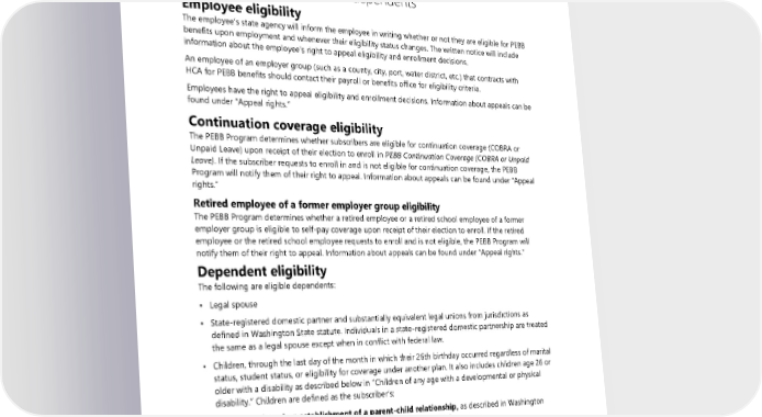Eligibility and enrollment In these sections, “health plan” is used to refer to a plan offering medical or dental, or both, developed by the Public Employees Benefits Board (PEBB) and provided by a contracted vendor or self-insured plans administered by the Health Care Authority (HCA). Eligibility for subscribers and dependents Employee eligibility The employee’s state agency will inform the employee in writing whether or not they are eligible for PEBB benefits upon employment and whenever their eligibility status changes. The written notice will include information about the employee’s right to appeal eligibility and enrollment decisions. An employee of an employer group (such as a county, city, port, water district, etc.) that contracts with HCA for PEBB benefits should contact their payroll or benefits office for eligibility criteria. Employees have the right to appeal eligibility and enrollment decisions. Information about appeals can be found under “Appeal rights.” Continuation coverage eligibility The PEBB Program determines whether subscribers are eligible for continuation coverage (COBRA or Unpaid Leave) upon receipt of their election to enroll in PEBB Continuation Coverage (COBRA or Unpaid Leave). If the subscriber requests to enroll in and is not eligible for continuation coverage, the PEBB Program will notify them of their right to appeal. Information about appeals can be found under “Appeal rights.” Retired employee of a former employer group eligibility The PEBB Program determines whether a retired employee or a retired school employee of a former employer group is eligible to self-pay coverage upon receipt of their election to enroll. If the retired employee or the retired school employee requests to enroll and is not eligible, the PEBB Program will notify them of their right to appeal. Information about appeals can be found under “Appeal rights.” Dependent eligibility The following are eligible dependents: • Legal spouse • State-registered domestic partner and substantially equivalent legal unions from jurisdictions as defined in Washington State statute. Individuals in a state-registered domestic partnership are treated the same as a legal spouse except when in conflict with federal law. • Children, through the last day of the month in which their 26th birthday occurred regardless of marital status, student status, or eligibility for coverage under another plan. It also includes children age 26 or older with a disability as described below in “Children of any age with a developmental or physical disability.” Children are defined as the subscriber’s: ▪ Children based on establishment of a parent-child relationship, as described in Washington State statutes, except when parental rights have been terminated. ▪ Children of the subscriber’s spouse, based on the spouse’s establishment of a parent-child relationship, except when parental rights have been terminated. The stepchild’s relationship to the subscriber (and eligibility as a dependent) ends on the same date the marriage with the spouse ends through divorce, annulment, dissolution, termination, or death. 140 2024 UMP CDHP (PEBB) Certificate of Coverage