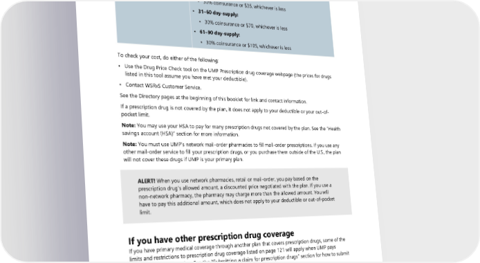 Tier and description How much you pay for covered insulins All network pharmacies (retail and mail-order) • 61–90-day supply: ▪ 10% coinsurance or $75, whichever is less Tier 2 (Tier 2) • 0-30 day-supply: ▪ 30% coinsurance or $35, whichever is less • 31–60 day-supply: ▪ 30% coinsurance or $70, whichever is less • 61–90 day-supply: ▪ 30% coinsurance or $105, whichever is less To check your cost, do either of the following: • Use the Drug Price Check tool on the UMP Prescription drug coverage webpage (the prices for drugs listed in this tool assume you have met your deductible). • Contact WSRxS Customer Service. See the Directory pages at the beginning of this booklet for link and contact information. If a prescription drug is not covered by the plan, it does not apply to your deductible or your out-of- pocket limit. Note: You may use your HSA to pay for many prescription drugs not covered by the plan. See the “Health savings account (HSA)” section for more information. Note: You must use UMP’s network mail-order pharmacies to fill mail-order prescriptions. If you use any other mail-order service to fill your prescription drugs, or you purchase them outside of the U.S., the plan will not cover these drugs if UMP is your primary plan. ALERT! When you use network pharmacies, retail or mail-order, you pay based on the prescription drug’s allowed amount, a discounted price negotiated with the plan. If you use a non-network pharmacy, the pharmacy may charge more than the allowed amount. You will have to pay this additional amount, which does not apply to your deductible or out-of-pocket limit. If you have other prescription drug coverage If you have primary medical coverage through another plan that covers prescription drugs, some of the limits and restrictions to prescription drug coverage listed on page 121 will apply when UMP pays secondary to another plan. See the “Submitting a claim for prescription drugs” section for how to submit your prescription drug claim. Using network pharmacies when UMP is secondary If you have primary coverage through another plan that covers prescription drugs, show both plan cards to the pharmacy and make sure they know which plan is primary. It is important that the pharmacy bills the plans in the correct order, or claims may be denied or paid incorrectly. 2024 UMP CDHP (PEBB) Certificate of Coverage 93