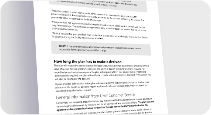 covered. Notice is usually done by the facility at the time you are admitted. Notice is not the same as preauthorization and many services require both. What is the difference between preauthorization and notice? ALERT! Many services, including, but not limited to, inpatient services, require both preauthorization and notice. Contact UMP Customer Service or talk to your provider if you have questions about services needing preauthorization or notice. “Preauthorization” is when your provider sends a request for coverage of a service on the UMP preauthorization list. Preauthorization is usually requested by the provider performing the services. The plan sends either an approval or denial of coverage. If the plan does not approve services that require preauthorization before services are received, the plan may deny coverage. The plan does not approve or deny preauthorization for services that are not on the UMP preauthorization list. “Notice” means that your provider must contact the plan to let us know when you receive services. Notice is usually done by the facility when you are admitted. ALERT! If the plan denies preauthorization and you receive those services anyway, you are responsible for the provider’s entire billed charge. How long the plan has to make a decision The plan will respond to standard preauthorization requests submitted by contracted providers, within 5 days of receipt for non-electronic requests and within 3 days of receipt for electronic requests. For expedited preauthorization requests, the plan will respond within 1 to 2 days of receipt. If additional information is required, the plan will notify the provider within the timelines described in this section. You will also be notified of the decision. If your provider believes that waiting for a decision under the standard preauthorization timeline could place your life, health, or ability to regain maximum function in serious danger, they can request an expedited preauthorization request. General information from UMP Customer Service For services not requiring preauthorization, you may contact UMP Customer Service to ask if a particular service is generally covered by the plan, and for an estimate of how much you will pay. The plan does not approve or deny preauthorization for services that are not on the UMP preauthorization list. Until a claim is submitted and reviewed, the plan cannot guarantee that your service will be covered or give you an exact amount you will pay out of pocket. This is because when a provider bills for a service, the plan pays for it based on procedure codes. Each code describes a service in some detail, and there are many codes for similar-sounding services. Your provider, not the plan, determines which of these codes is used on the submitted claim. Alternative benefits Alternative benefits mean benefits for services or supplies that are not otherwise covered as specified in this COC, but for which the plan may approve coverage after case management evaluation. The plan may 2024 UMP CDHP (PEBB) Certificate of Coverage 105