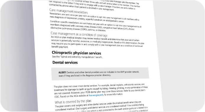 How to get started Providers may refer members, and Regence also proactively reaches out to members most likely to benefit from care management support. Members can also self-refer by calling Regence at 1-866-543- 5765 (TRS: 711) for information about care management services. What’s next Once a member is identified for care management, the designated case manager calls the member. The Regence case manager will attempt at least three calls and will send a letter to the member. The member can respond to the letter if they wish to engage with a case manager. Providers are sent a letter or contacted by phone when their patient is enrolled in care management. Care management newsletters Newsletters are sent once per year with an option to opt into care management to all members with a new diagnosis of depression, anxiety, a painful condition, or adult/pediatric cancer. Condition-specific newsletters are sent twice per year with an option to opt into care management to all members diagnosed with coronary artery disease (CAD), congestive heart failure (CHF), chronic obstructive pulmonary disease (COPD), asthma, or diabetes. Case management as a condition of coverage An HCA or plan medical director may review medical records and determine that your use of certain services is potentially harmful, excessive, or medically inappropriate. Based on this determination, the plan may require you to participate in and comply with a case management plan as a condition of continued benefit payment. Chiropractic physician services See the “Spinal and extremity manipulations” benefit. Dental services ALERT! Dentists and other dental providers are not included in the UMP provider network, even if they are listed in the Regence provider directory. The plan does not cover most dental services. For example, dental implants, orthodontic services, and treatment for damage to teeth or gums caused by biting, chewing, grinding, or any combination of these are not covered. However, your PEBB dental plan may cover these services. Refer to your dental plan’s COC, found on the HCA website at hca.wa.gov/erb, for more information. What is covered by the plan The plan covers oral surgery and other dental services under the medical benefit when they are considered medical. Oral surgery and dental services are considered medical if the condition being diagnosed and treated is either one which is not connected to the teeth and/or gums or is related to a disease or illness that affects the whole body. These medical services may be performed by a dentist or medical professional provider. You can find examples of these medical services in the Regence Medical Policy Administrative Guidelines to Determine Dental vs Medical Services by visiting the UMP Policies that affect your care webpage (see Directory for link). You pay 20 percent of the allowed amount for covered dental services unless otherwise stated, and the provider may balance bill you. 2024 UMP CDHP (PEBB) Certificate of Coverage 45