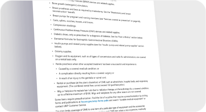 You pay the standard rate for covered DME services and supplies if they are prescribed by a provider practicing within their scope of practice, medically necessary, and used to treat a covered condition, including, but not limited to: • Artificial limbs or eyes (including implant lenses prescribed by a physician and required due to cataract surgery or to replace a missing portion of the eye). • Automatic Positive Airway Pressure (APAP) devices and related supplies. • Bi-level Positive Airway Pressure (BiPAP) devices and related supplies. • Bone growth (osteogenic) stimulators. • Breast prostheses and bras as required by mastectomy. See the “Mastectomy and breast reconstruction” benefit. • Breast pumps for pregnant and nursing members (see “Services covered as preventive” on page 64). • Casts, splints, crutches, trusses, and braces. • Compression stockings. • Continuous Positive Airway Pressure (CPAP) devices and related supplies. • Diabetic shoes, only as prescribed for a diagnosis of diabetes. See the “Foot orthotics” section below. • Elemental formulas for Eosinophilic Gastrointestinal Disorders (EGIDs). • Insulin pumps and related pump supplies (see the “Insulin pumps and related pump supplies” section below). • Ostomy supplies. • Oxygen and its equipment, such as all types of concentrators and tanks for administration, are covered on a rental basis only. • Penile prosthesis when other accepted treatment has been unsuccessful and impotence is: ▪ Caused by a covered medical condition; or ▪ A complication directly resulting from a covered surgery; or ▪ A result of an injury to the genitalia or spinal cord. • Rental or purchase (at the plan's discretion) of DME such as wheelchairs, hospital beds, and respiratory equipment. (The combined rental fees cannot exceed full purchase price.) • Wig or hairpiece to replace hair loss due to radiation therapy or chemotherapy for a covered condition, up to a lifetime maximum of $100. Wigs and hairpieces for any other reason are not covered. Some items require preauthorization. Find the list of supplies that require a preauthorization by visiting forms and publications at hca.wa.gov/ump-forms-pubs and search “durable medical equipment” or contact UMP Customer Service. The plan limits coverage of DME to one item of a particular type of equipment and the accessories needed to operate the item. If you receive a higher-cost DME item when a less expensive, medically appropriate option is available, the plan will not pay for the more expensive item. The plan also covers the repair or replacement of DME due to normal use or a change in the member’s condition (including the growth of a child). You are responsible for the entire cost of any additional pieces of the same or similar DME you purchase or rent for personal convenience or mobility. Note: The plan does not cover replacement of lost, stolen, expired, or damaged DME. 2024 UMP CDHP (PEBB) Certificate of Coverage 49