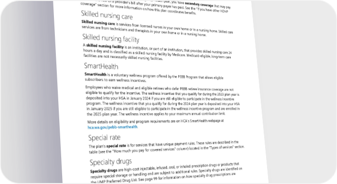 Screening Screening refers to services performed to prevent or detect illness in the absence of disease or symptoms. Secondary coverage When you are covered by more than one group health plan, you have secondary coverage that may pay a part or the rest of a provider’s bill after your primary payer has paid. See the “If you have other HDHP coverage” section for more information on how this plan coordinates benefits. Skilled nursing care Skilled nursing care is services from licensed nurses in your own home or in a nursing home. Skilled care services are from technicians and therapists in your own home or in a nursing home. Skilled nursing facility A skilled nursing facility is an institution, or part of an institution, that provides skilled nursing care 24 hours a day and is classified as a skilled nursing facility by Medicare. Medicaid-eligible, long-term care facilities are not necessarily skilled nursing facilities. SmartHealth SmartHealth is a voluntary wellness program offered by the PEBB Program that allows eligible subscribers to earn wellness incentives. Employees who waive medical and eligible retirees who defer PEBB retiree insurance coverage are not eligible to qualify for the incentive. The wellness incentive that you qualify for during the 2023 plan year is deposited into your HSA in January 2024 if you are still eligible to participate in the wellness incentive program. The wellness incentive that you qualify for during the 2024 plan year is deposited into your HSA in January 2025 if you are still eligible to participate in the wellness incentive program and are enrolled in the 2025 plan year. The wellness incentive applies to your maximum annual contribution limit. More details on eligibility and program requirements are on HCA's SmartHealth webpage at hca.wa.gov/pebb-smarthealth. Special rate The plan’s special rate is for services that have unique payment rules. These rules are described in the table (see the “How much you pay for covered services” column) located in the “Types of services” section. Specialty drugs Specialty drugs are high-cost injectable, infused, oral, or inhaled prescription drugs or products that require special storage or handling and are subject to additional rules. Specialty drugs are identified on the UMP Preferred Drug List. See page 99 for information on how specialty drug prescriptions are handled. Standard rate The plan’s standard rate depends on the provider’s status: • Preferred providers: You pay 15 percent of the allowed amount after you meet your deductible. The plan pays 85 percent of the allowed amount. 190 2024 UMP CDHP (PEBB) Certificate of Coverage