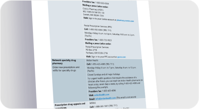 Contact type and description Contact information Order new prescriptions and UMP members do not need to be Costco members to use their refills, check order status, manage mail-order service. prescriptions, track your package Call: 1-800-607-6861 (TRS: 711) Monday–Friday: 5 a.m. to 7 p.m.; Saturday: 9:30 a.m. to 2 p.m. (Pacific) Providers fax: 1-800-633-0334 Mailing a prescription order: Costco Pharmacy (#581) 802 134th St SW STE 140 Everett, WA 98204-7314 Visit: Sign in to your Costco account at pharmacy.costco.com Postal Prescription Services (PPS) Call: 1-800-552-6694 (TRS: 711) Monday–Friday: 6 a.m. to 6 p.m.; Saturday: 9:30 a.m. to 2 p.m. (Pacific) Providers fax: 1-800-723-9023 Mailing a prescription order: Postal Prescription Services PO Box 2718 Portland, OR 97208-2718 Visit: Sign in to your PPS account at ppsrx.com Network specialty drug Ardon Health pharmacy Call: 1-855-425-4085 (TRS: 711) Order new prescriptions and Monday–Friday: 8 a.m. to 7 p.m.; Saturday: 8 a.m. to 12 p.m. refills for specialty drugs (Pacific) Closed Sundays and all major holidays For urgent health questions that require the assistance of a clinician after-hours, you can reach an Ardon Health pharmacist 24 hours a day, seven days a week, by calling 1-855-425-4085 and following the prompts. Providers fax: 1-855-425-4096 Visit: ardonhealth.com Email: [email protected] (This email is not secure) Prescription drug appeals and WSRxS complaints Call: 1-888-361-1611 (TRS: 711) Monday–Friday: 7:30 a.m. to 5:30 p.m. (Pacific) Fax appeals to: 1-866-923-0412 Mail: WSRxS Attn: Appeal Unit PO Box 40168 Portland, OR 97240-0168 6 2024 UMP CDHP (PEBB) Certificate of Coverage