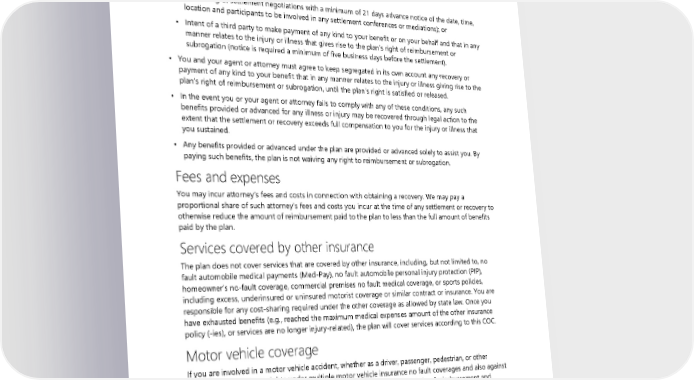 • You will not do anything to prejudice the plan’s rights and that you will cooperate fully with the plan, including signing any documents within the required time and providing prompt notice of any settlement or other recovery. You must notify the plan of any facts that may impact the right to reimbursement or subrogation, including, but not necessarily limited to, the following: ▪ The filing of a lawsuit; ▪ The making of a claim against any third party; ▪ Scheduling of settlement negotiations with a minimum of 21 days advance notice of the date, time, location and participants to be involved in any settlement conferences or mediations); or ▪ Intent of a third party to make payment of any kind to your benefit or on your behalf and that in any manner relates to the injury or illness that gives rise to the plan’s right of reimbursement or subrogation (notice is required a minimum of five business days before the settlement). • You and your agent or attorney must agree to keep segregated in its own account any recovery or payment of any kind to your benefit that in any manner relates to the injury or illness giving rise to the plan’s right of reimbursement or subrogation, until the plan’s right is satisfied or released. • In the event you or your agent or attorney fails to comply with any of these conditions, any such benefits provided or advanced for any illness or injury may be recovered through legal action to the extent that the settlement or recovery exceeds full compensation to you for the injury or illness that you sustained. • Any benefits provided or advanced under the plan are provided or advanced solely to assist you. By paying such benefits, the plan is not waiving any right to reimbursement or subrogation. Fees and expenses You may incur attorney’s fees and costs in connection with obtaining a recovery. We may pay a proportional share of such attorney’s fees and costs you incur at the time of any settlement or recovery to otherwise reduce the amount of reimbursement paid to the plan to less than the full amount of benefits paid by the plan. Services covered by other insurance The plan does not cover services that are covered by other insurance, including, but not limited to, no fault automobile medical payments (Med-Pay), no fault automobile personal injury protection (PIP), homeowner’s no-fault coverage, commercial premises no fault medical coverage, or sports policies, including excess, underinsured or uninsured motorist coverage or similar contract or insurance. You are responsible for any cost-sharing required under the other coverage as allowed by state law. Once you have exhausted benefits (e.g., reached the maximum medical expenses amount of the other insurance policy (-ies), or services are no longer injury-related), the plan will cover services according to this COC. Motor vehicle coverage If you are involved in a motor vehicle accident, whether as a driver, passenger, pedestrian, or other capacity, you may have rights under multiple motor vehicle insurance no fault coverages and also against a third party who may be responsible for the accident. In that case, this right of reimbursement and subrogation provision still applies. Future medical expenses Benefits for otherwise covered services may be excluded as follows: 132 2024 UMP CDHP (PEBB) Certificate of Coverage