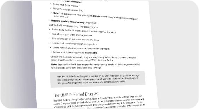 Your prescription drug benefit See the Directory for prescription drug contact information. Your plan’s prescription drug benefit is managed by a partnership of companies known as Washington State Rx Services (WSRxS): • Preauthorization, appeals, and customer service: Moda Health • Network mail-order pharmacies: ▪ Costco Mail-Order Pharmacy ▪ Postal Prescription Services (PPS) ▪ Note: The plan does not cover prescription drugs purchased through mail-order pharmacies located outside the U.S. • Network specialty drug pharmacy: Ardon Health Visit the UMP Prescription drug coverage webpage to: • Find a link to the UMP Preferred Drug List and the Drug Price Check tool. • Find a link to your online pharmacy account. • Find information on mail-order and specialty drugs. • Learn about submitting prescription drug claims. • Locate network pharmacies or network vaccination pharmacies. • Review prescription drug policies and programs. Contact the mail-order or specialty drug pharmacy directly for help placing or tracking prescription orders. If additional help is needed, contact WSRxS Customer Service. Note: Regence BlueShield does not provide prescription drug benefits for UMP. Always contact WSRxS with questions about your prescription drug coverage. TIP: The UMP Preferred Drug List is available on the UMP Prescription drug coverage webpage (see Directory for link). On this webpage, you will also find a link to the Drug Price Check tool (the prices for drugs listed in this tool assume you have met your deductible). The UMP Preferred Drug List The UMP Preferred Drug List (sometimes called a “formulary”) lists all of the preferred drugs that UMP covers. Drugs not listed on the Preferred Drug List are not covered unless an exception is requested and approved by UMP. Excluded prescription drugs and products are not eligible for an exception. For the exception process, refer to “Requesting an exception for noncovered prescription drugs” on page 89. The UMP Preferred Drug List includes: • If the plan must preauthorize a prescription drug (see page 98) • If you must purchase a prescription drug from the plan’s network specialty drug pharmacy (see page 99) • If there are any limits on a prescription drug’s coverage (see the "Limits on your prescription drug coverage" section) 2024 UMP CDHP (PEBB) Certificate of Coverage 87