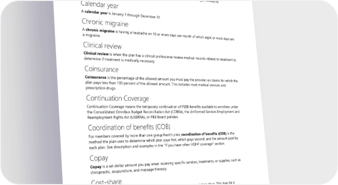 Business day Business days are Mondays through Fridays, except for legal holidays observed by Washington State. Calendar day A calendar day is any day of the week regardless of whether it is observed as a legal holiday by Washington State. Calendar year A calendar year is January 1 through December 31. Chronic migraine A chronic migraine is having a headache on 15 or more days per month of which eight or more days are a migraine. Clinical review Clinical review is when the plan has a clinical professional review medical records related to treatment to determine if treatment is medically necessary. Coinsurance Coinsurance is the percentage of the allowed amount you must pay the provider on claims for which the plan pays less than 100 percent of the allowed amount. This includes most medical services and prescription drugs. Continuation Coverage Continuation Coverage means the temporary continuation of PEBB benefits available to enrollees under the Consolidated Omnibus Budget Reconciliation Act (COBRA), the Uniformed Services Employment and Reemployment Rights Act (USERRA), or PEB Board policies. Coordination of benefits (COB) For members covered by more than one group health plan, coordination of benefits (COB) is the method the plan uses to determine which plan pays first, which pays second, and the amount paid by each plan. See description and examples in the “If you have other HDHP coverage” section. Copay Copay is a set dollar amount you pay when receiving specific services, treatments, or supplies, such as chiropractic, acupuncture, and massage therapy. Cost-share Cost-share means the amount you pay for a service, supply, or prescription drug. This may be a deductible, coinsurance, or amounts not covered by the plan. Custodial care Custodial care is care primarily to assist in activities of daily living, including institutional care primarily to support self-care and provide room and board. Custodial care includes, but is not limited to, help in 172 2024 UMP CDHP (PEBB) Certificate of Coverage