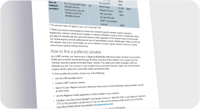 Provider Must provider accept Balance Itemized payments You owe type allowed amount? billing provider allowed? Participating Yes. You pay 40% of the No Billed charge: $1,000 $360 provider allowed amount Allowed amount: $900 (coinsurance). Plan pays 60%: -$540 You pay 40%: $360 Out-of- No. You pay 40% of the Yes Billed charge: $1,000 $460* network allowed amount Allowed amount: $900 provider* (coinsurance), plus all Plan pays 60%: -$540 charges above the You pay 40% plus allowed amount. $100** over allowed amount: $460* * This amount does not apply to your out-of-pocket limit. ** When you receive nonemergency services at a network hospital, network hospital outpatient department, network critical access hospital, or network ambulatory surgical center in Washington State, you pay the network rate and cannot be balance billed regardless of the network status of the provider. For nonemergency services performed at one of these facilities outside of Washington State, you still pay the network rate, but in some states, an out-of-network provider may be allowed to ask you to waive some of your balance billing protections. How to find a preferred provider As a UMP member, you have access to Regence BlueShield preferred providers and Blue Cross and Blue Shield plan providers worldwide through the Blue Cross Blue Shield Global® Core program (see the “Services received outside the United States” section). This means your health coverage is with you wherever you are. Your access to care includes many acute care hospitals, urgent care and ambulatory surgery centers, physicians, and other health care professionals. To find a preferred provider, choose one of the following: • Use the UMP provider search. • Contact UMP Customer Service. • Sign in to your Regence account, where you have access to more information about providers, as well as other tools. • Use the Regence mobile application to find providers in your network. • Call Blue Cross Blue Shield Global® Core Service Center at 1-800-810-2583 or call collect at 1-804-673- 1177 to find providers outside the U.S. You can also use the online provider search tool on the Blue Cross Blue Shield Global Core website at bcbsglobalcore.com. • Visit the Prescription drug coverage webpage to locate network pharmacies. See the Directory pages at the beginning of this booklet for links and contact information. 18 2024 UMP CDHP (PEBB) Certificate of Coverage