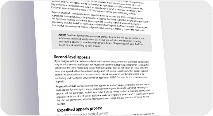 • Medical records from your provider, if applicable. Your provider should supply clinically relevant information, such as medical records for services denied based on medical necessity or for other clinical reasons. The plan must receive all relevant information with the appeal to make sure the most accurate decision is made. First-level appeals You or your authorized representative may submit a first-level appeal no more than 180 days after you receive the plan’s decision. If you do not submit an appeal within this time, your appeal will not be reviewed, and you will not be able to continue further appeals (second-level and external review). You may authorize a representative to submit an appeal on your behalf in writing or by contacting UMP Customer Service (medical appeals) or WSRxS Customer Service (prescription drug appeals). Regence BlueShield manages first-level appeals for medical services, and WSRxS manages first-level appeals for prescription drugs. Employees from Regence BlueShield and WSRxS reviewing the appeals will not have been involved in the initial decision you are appealing. Administrative staff review claim processing disputes. A staff of health care professionals at Regence BlueShield or WSRxS evaluate appeals that involve issues requiring medical judgment about covering, authorizing, or providing health care. ALERT! Deadlines for submitting an appeal are based on the first date you are notified of how a claim was processed, usually when you receive you an Explanation of Benefits (including services that applied to your deductible or were denied). The plan does not waive deadlines based on untimely billing by your provider. Second-level appeals If you disagree with the decision made on your first-level appeal, you or your authorized representative may submit a second-level appeal. You must submit second-level appeals no more than 180 days after you receive the letter responding to your first-level appeal. If you do not submit an appeal within this time, your appeal will not be reviewed, and you will not be able to continue further appeals (external review). You may authorize a representative to submit an appeal on your behalf in writing or by contacting UMP Customer Service (medical appeals) or WSRxS Customer Service (prescription drug appeals). Regence BlueShield manages second-level appeals for medical services, and WSRxS manages second- level appeals for prescription drugs. Employees from Regence BlueShield and WSRxS reviewing the appeals will not have been involved in, or subordinate to anyone involved in, reviewing the first-level appeal or initial decision. If new or additional evidence or rationale is considered in reviewing your appeal, the plan will provide you with this information free of charge, and you may respond before the final decision. Expedited appeals process Expedited appeals for medical services You or your authorized representative may submit an expedited appeal within 180 days of receiving the previous decision if: • You are currently receiving or prescribed treatment or benefits that would end because of the denial; or • Your provider determines that taking the usual time allowed could seriously affect your life, health, or ability to regain maximum function, or would subject you to severe pain that cannot be adequately managed without the disputed care or treatment; or 2024 UMP CDHP (PEBB) Certificate of Coverage 127