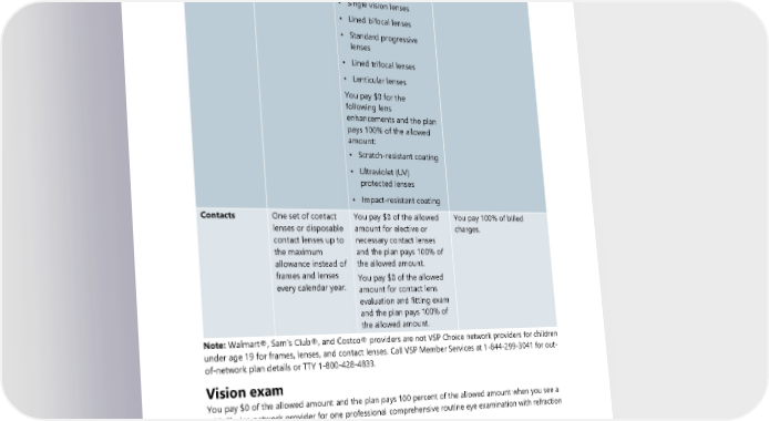 Benefit Frequency Your cost with a VSP Your cost with an out-of- Choice network provider network provider Lenses and One set per calendar You pay $0 for the You pay 100% of billed enhancements year. following covered lenses charges. and the plan pays 100% of the allowed amount: • Single vision lenses • Lined bifocal lenses • Standard progressive lenses • Lined trifocal lenses • Lenticular lenses You pay $0 for the following lens enhancements and the plan pays 100% of the allowed amount: • Scratch-resistant coating • Ultraviolet (UV) protected lenses • Impact-resistant coating Contacts One set of contact You pay $0 of the allowed You pay 100% of billed lenses or disposable amount for elective or charges. contact lenses up to necessary contact lenses the maximum and the plan pays 100% of allowance instead of the allowed amount. frames and lenses You pay $0 of the allowed every calendar year. amount for contact lens evaluation and fitting exam and the plan pays 100% of the allowed amount. Note: Walmart®, Sam’s Club®, and Costco® providers are not VSP Choice network providers for children under age 19 for frames, lenses, and contact lenses. Call VSP Member Services at 1-844-299-3041 for out- of-network plan details or TTY 1-800-428-4833. Vision exam You pay $0 of the allowed amount and the plan pays 100 percent of the allowed amount when you see a VSP Choice network provider for one professional comprehensive routine eye examination with refraction or visual analysis per calendar year, including: • Prescribing and ordering proper lenses; • Verifying the accuracy of the finished lenses; and • Progress or follow-up work as necessary. 84 2024 UMP CDHP (PEBB) Certificate of Coverage
