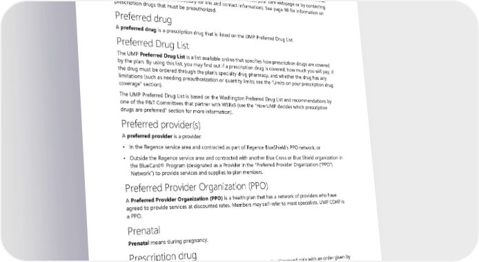 Preauthorization Preauthorization is plan approval for coverage of specific services, supplies, or prescription drugs before they are provided to the member. Preauthorization is not a guarantee of coverage. If you or your provider do not receive preauthorization for certain medical services or prescription drugs, the plan may deny the claim. See the “Preauthorizing medical services” section for how this works. A list of medical services that require preauthorization is available on the UMP Policies that affect your care webpage or by contacting UMP Customer Service (see Directory for link and contact information). See page 98 for information on prescription drugs that must be preauthorized. Preferred drug A preferred drug is a prescription drug that is listed on the UMP Preferred Drug List. Preferred Drug List The UMP Preferred Drug List is a list available online that specifies how prescription drugs are covered by the plan. By using this list, you may find out if a prescription drug is covered, how much you will pay, if the drug must be ordered through the plan’s specialty drug pharmacy, and whether the drug has any limitations (such as needing preauthorization or quantity limits; see the ”Limits on your prescription drug coverage” section). The UMP Preferred Drug List is based on the Washington Preferred Drug List and recommendations by one of the P&T Committees that partner with WSRxS (see the “How UMP decides which prescription drugs are preferred” section for more information). Preferred provider(s) A preferred provider is a provider: • In the Regence service area and contracted as part of Regence BlueShield’s PPO network; or • Outside the Regence service area and contracted with another Blue Cross or Blue Shield organization in the BlueCard® Program (designated as a Provider in the “Preferred Provider Organization (“PPO”) Network”) to provide services and supplies to plan members. Preferred Provider Organization (PPO) A Preferred Provider Organization (PPO) is a health plan that has a network of providers who have agreed to provide services at discounted rates. Members may self-refer to most specialists. UMP CDHP is a PPO. Prenatal Prenatal means during pregnancy. Prescription drug Prescription drug means a drug approved by the FDA that can be dispensed only with an order given by a properly authorized person. The designation of a medication as a prescription drug is made by the FDA. Preventive care Preventive care means those services described by the Public Health Services Act, Section 2713: • Covered immunizations recommended by the CDC. 186 2024 UMP CDHP (PEBB) Certificate of Coverage