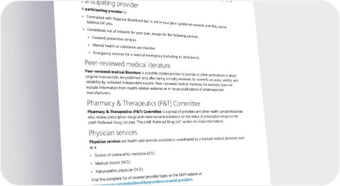 Partial Hospitalization Program Partial Hospitalization Program (PHP) is an outpatient program that is provided under the supervision of an attending psychiatrist or psychiatric extender. PHP is intended to provide treatment on an outpatient basis, does not include boarding or housing, and is intended to provide treatment interventions in a structured setting, with patients returning to their home environments each day. PHP is a minimum of five hours per day, five days per week. Participating provider A participating provider is: • Contracted with Regence BlueShield but is not in your plan’s preferred network, and they cannot balance bill you. • Considered out of network for your plan, except for the following services: ▪ Covered preventive services. ▪ Mental health or substance use disorder. ▪ Emergency services for a medical emergency (including air ambulance). Peer-reviewed medical literature Peer-reviewed medical literature is scientific studies printed in journals or other publications in which original manuscripts are published only after being critically reviewed for scientific accuracy, validity, and reliability by unbiased independent experts. Peer-reviewed medical literature, for example, does not include information from health-related websites or in-house publications of pharmaceutical manufacturers. Pharmacy & Therapeutics (P&T) Committee Pharmacy & Therapeutics (P&T) Committee is a group of providers and other health care professionals who review prescription drugs and make recommendations on the status of prescription drugs on the UMP Preferred Drug List (see “The UMP Preferred Drug List” section for more information). Physician services Physician services are health care services provided or coordinated by a licensed medical physician, such as a: • Doctor of osteopathic medicine (D.O.) • Medical doctor (M.D.) • Naturopathic physician (N.D.) Find the complete list of covered provider types on the UMP website at ump.regence.com/pebb/benefits/providers/covered-providers. Plan Plan, as referred to in this document, means Uniform Medical Plan Consumer-directed Health Plan (UMP CDHP), a self-insured PPO plan offered by the PEBB Program. In the eligibility sections (see “Eligibility for subscribers and dependents on page 140 or 155), “plan” may include other plans not sponsored by the PEBB Program. In the “If you have other HDHP coverage” section, “plan” may mean any health insurance coverage. 2024 UMP CDHP (PEBB) Certificate of Coverage 185