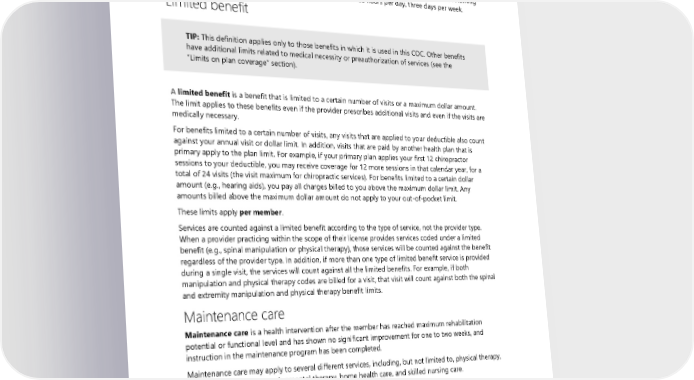 Intensive Outpatient Program Intensive Outpatient Program (IOP) is an outpatient program that is licensed as a facility or agency by the appropriate state agency and is provided under the supervision of a psychiatrist or psychiatric extender. IOP is intended to provide treatment on an outpatient basis, does not include boarding or housing, and is intended to provide treatment interventions in a structured setting, with patients returning to their home environments each day. IOP is a minimum of three hours per day, three days per week. Limited benefit TIP: This definition applies only to those benefits in which it is used in this COC. Other benefits have additional limits related to medical necessity or preauthorization of services (see the “Limits on plan coverage” section). A limited benefit is a benefit that is limited to a certain number of visits or a maximum dollar amount. The limit applies to these benefits even if the provider prescribes additional visits and even if the visits are medically necessary. For benefits limited to a certain number of visits, any visits that are applied to your deductible also count against your annual visit or dollar limit. In addition, visits that are paid by another health plan that is primary apply to the plan limit. For example, if your primary plan applies your first 12 chiropractor sessions to your deductible, you may receive coverage for 12 more sessions in that calendar year, for a total of 24 visits (the visit maximum for chiropractic services). For benefits limited to a certain dollar amount (e.g., hearing aids), you pay all charges billed to you above the maximum dollar limit. Any amounts billed above the maximum dollar amount do not apply to your out-of-pocket limit. These limits apply per member. Services are counted against a limited benefit according to the type of service, not the provider type. When a provider practicing within the scope of their license provides services coded under a limited benefit (e.g., spinal manipulation or physical therapy), those services will be counted against the benefit regardless of the provider type. In addition, if more than one type of limited benefit service is provided during a single visit, the services will count against all the limited benefits. For example, if both manipulation and physical therapy codes are billed for a visit, that visit will count against both the spinal and extremity manipulation and physical therapy benefit limits. Maintenance care Maintenance care is a health intervention after the member has reached maximum rehabilitation potential or functional level and has shown no significant improvement for one to two weeks, and instruction in the maintenance program has been completed. Maintenance care may apply to several different services, including, but not limited to, physical therapy, speech therapy, neurodevelopmental therapy, home health care, and skilled nursing care. Medical Medical generally refers to all plan benefits and services other than those covered under preventive care and prescription drug benefits (except as the term is used in the eligibility sections of this COC). 2024 UMP CDHP (PEBB) Certificate of Coverage 179