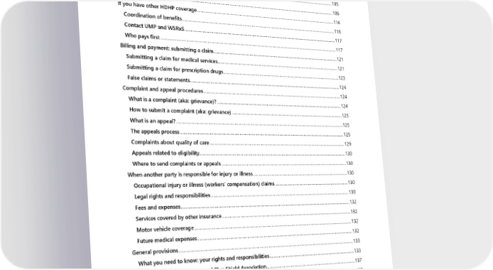 What to do if the plan denies coverage .......................................................................................................................... 102 Prescription drugs and products UMP does not cover ............................................................................................ 102 Limits on plan coverage .............................................................................................................................................................. 103 Preauthorizing medical services ......................................................................................................................................... 103 General information from UMP Customer Service ..................................................................................................... 105 What the plan does not cover .................................................................................................................................................. 106 If you have other HDHP coverage .......................................................................................................................................... 116 Coordination of benefits ........................................................................................................................................................ 116 Contact UMP and WSRxS ....................................................................................................................................................... 117 Who pays first ............................................................................................................................................................................. 117 Billing and payment: submitting a claim ............................................................................................................................. 121 Submitting a claim for medical services.......................................................................................................................... 121 Submitting a claim for prescription drugs ..................................................................................................................... 123 False claims or statements ..................................................................................................................................................... 124 Complaint and appeal procedures ......................................................................................................................................... 124 What is a complaint (aka: grievance)? ............................................................................................................................. 124 How to submit a complaint (aka: grievance) ................................................................................................................ 125 What is an appeal? .................................................................................................................................................................... 125 The appeals process ................................................................................................................................................................. 125 Complaints about quality of care ....................................................................................................................................... 129 Appeals related to eligibility................................................................................................................................................. 130 Where to send complaints or appeals ............................................................................................................................. 130 When another party is responsible for injury or illness ................................................................................................ 130 Occupational injury or illness (workers’ compensation) claims ........................................................................... 130 Legal rights and responsibilities ......................................................................................................................................... 130 Fees and expenses ..................................................................................................................................................................... 132 Services covered by other insurance ................................................................................................................................ 132 Motor vehicle coverage .......................................................................................................................................................... 132 Future medical expenses ........................................................................................................................................................ 132 General provisions ......................................................................................................................................................................... 133 What you need to know: your rights and responsibilities ...................................................................................... 133 Relationship to Blue Cross and Blue Shield Association .......................................................................................... 137 Right to receive and release needed information ...................................................................................................... 137 Right of recovery ....................................................................................................................................................................... 137 Limitations on liability ....................................................................................................................................