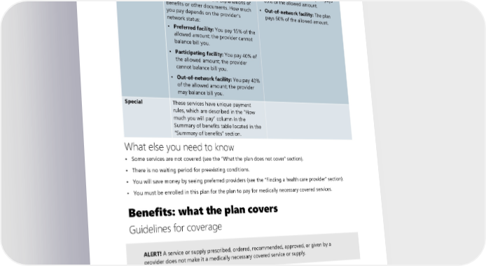 Type of service How much you pay for covered How much the plan pays for covered services services Facility You may be charged facility fees in • Preferred facility: The plan pays 85% addition to provider fees when accessing of the allowed amount. clinics, ambulatory surgery centers, and • Participating facility: The plan pays other facilities. A facility may be referred 60% of the allowed amount. to as a “provider” on the Explanations of • Out-of-network facility: The plan Benefits or other documents. How much pays 60% of the allowed amount. you pay depends on the provider’s network status: • Preferred facility: You pay 15% of the allowed amount; the provider cannot balance bill you. • Participating facility: You pay 40% of the allowed amount; the provider cannot balance bill you. • Out-of-network facility: You pay 40% of the allowed amount; the provider may balance bill you. Special These services have unique payment rules, which are described in the “How much you will pay” column in the Summary of benefits table located in the “Summary of benefits” section. What else you need to know • Some services are not covered (see the “What the plan does not cover” section). • There is no waiting period for preexisting conditions. • You will save money by seeing preferred providers (see the “Finding a health care provider” section). • You must be enrolled in this plan for the plan to pay for medically necessary covered services. Benefits: what the plan covers Guidelines for coverage ALERT! A service or supply prescribed, ordered, recommended, approved, or given by a provider does not make it a medically necessary covered service or supply. This plan will cover a service or supply, if it meets all of the following conditions. The service or supply must: • Be listed as covered; and • Be medically necessary; and 34 2024 UMP CDHP (PEBB) Certificate of Coverage