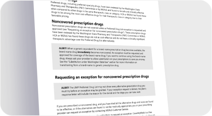 • If there are less expensive alternatives The UMP Preferred Drug List is updated online throughout the year, and how a prescription drug is covered may change at any time. You may look up your prescription drugs online on the UMP Prescription drug coverage webpage or by contacting WSRxS. New brand-name prescription drugs may not be covered during the first 180 days they are available. To check if a new prescription drug is covered, contact WSRxS Customer Service. Preferred drugs Preferred drugs, including preferred specialty drugs, have been reviewed by the Washington State Pharmacy and Therapeutics (P&T) Committee or by WSRxS and found to be safe and clinically effective when compared to other drugs in the same therapeutic class or category. HCA or WSRxS has found these drugs to be among the most cost-effective drugs for their therapeutic class or category due to their favorable pricing. Noncovered prescription drugs Noncovered prescription drugs are not covered unless a Preferred Drug List exception is requested and approved (see “Requesting an exception for noncovered prescription drugs”). These prescription drugs have been reviewed by the Washington State Pharmacy and Therapeutics (P&T) Committee or WSRxS. HCA or WSRxS has found these drugs are not as cost-effective and do not have a clinically significant therapeutic advantage over the Preferred Drug List alternative(s). ALERT! When a generic equivalent for a brand-name prescription drug becomes available, the brand-name drug immediately becomes noncovered. An exception must be requested and approved for coverage of the brand-name drug if you want to continue using the brand-name drug. Always ask your provider to allow substitution on your prescriptions to save you money. See the “Substitution under Washington State law” section for more information on transitioning from a brand-name to generic prescription drug. Requesting an exception for noncovered prescription drugs ALERT! The UMP Preferred Drug List may not show every alternative prescription drug you must try before an exception may be granted. If your exception request is denied, the plan’s response letter will include the reason for the denial and the steps you can take next. If you are prescribed a noncovered drug, and you have tried all the alternative drugs and none are found to be effective, or if the alternatives are found to not be medically appropriate, you or your prescribing provider can request an exception by contacting WSRxS Customer Service. Your prescribing provider can also use CoverMyMeds to request an exception. CoverMyMeds is a free online platform that reviews exception requests from electronic health record systems or directly through the CoverMyMeds portal. To get started, have your provider visit the CoverMyMeds website (see Directory for link). Your prescribing provider must submit clinical information to request an exception. When the plan approves an exception based on the criteria below, you will pay 15 percent of the drug’s cost per 30-day supply after you pay your deductible, except for noncovered insulins. For noncovered insulins, when the 88 2024 UMP CDHP (PEBB) Certificate of Coverage