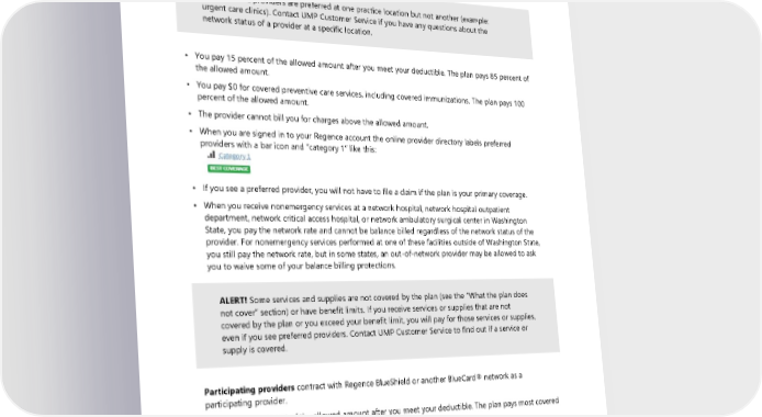 If you use Find a Doctor by searching as a guest, you will only see preferred providers. You can confirm a provider’s network status before your visit by using the provider search or contacting UMP Customer Service. Preferred providers are in the Preferred Provider Organization (PPO) network that applies to UMP CDHP members. ALERT! Some providers are preferred at one practice location but not another (example: urgent care clinics). Contact UMP Customer Service if you have any questions about the network status of a provider at a specific location. • You pay 15 percent of the allowed amount after you meet your deductible. The plan pays 85 percent of the allowed amount. • You pay $0 for covered preventive care services, including covered immunizations. The plan pays 100 percent of the allowed amount. • The provider cannot bill you for charges above the allowed amount. • When you are signed in to your Regence account the online provider directory labels preferred providers with a bar icon and “category 1” like this: • If you see a preferred provider, you will not have to file a claim if the plan is your primary coverage. • When you receive nonemergency services at a network hospital, network hospital outpatient department, network critical access hospital, or network ambulatory surgical center in Washington State, you pay the network rate and cannot be balance billed regardless of the network status of the provider. For nonemergency services performed at one of these facilities outside of Washington State, you still pay the network rate, but in some states, an out-of-network provider may be allowed to ask you to waive some of your balance billing protections. ALERT! Some services and supplies are not covered by the plan (see the “What the plan does not cover” section) or have benefit limits. If you receive services or supplies that are not covered by the plan or you exceed your benefit limit, you will pay for those services or supplies, even if you see preferred providers. Contact UMP Customer Service to find out if a service or supply is covered. Participating providers contract with Regence BlueShield or another BlueCard® network as a participating provider. • You pay 40 percent of the allowed amount after you meet your deductible. The plan pays most covered services at 60 percent of the allowed amount. • You pay $0 for covered preventive care services, including covered immunizations. The plan pays 100 percent of the allowed amount. • The provider cannot bill you for charges above the allowed amount. 16 2024 UMP CDHP (PEBB) Certificate of Coverage
