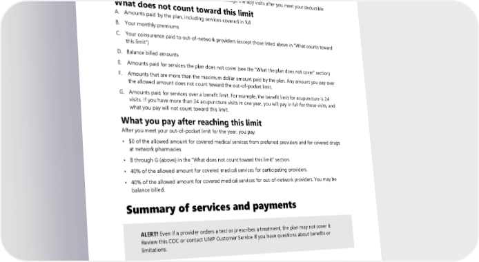 • Your coinsurance paid to preferred and participating providers • Your coinsurance paid to out-of-network providers for emergency room services, air ambulance, and nonemergency services furnished during a visit or stay at a preferred and participating hospital, hospital outpatient department, critical access hospital, or ambulatory surgical center. • Your deductible paid to preferred and participating providers • Your copay for chiropractic, acupuncture, and massage therapy visits after you meet your deductible What does not count toward this limit A. Amounts paid by the plan, including services covered in full B. Your monthly premiums C. Your coinsurance paid to out-of-network providers (except those listed above in “What counts toward this limit”) D. Balance billed amounts E. Amounts paid for services the plan does not cover (see the “What the plan does not cover” section) F. Amounts that are more than the maximum dollar amount paid by the plan. Any amount you pay over the allowed amount does not count toward the out-of-pocket limit. G. Amounts paid for services over a benefit limit. For example, the benefit limit for acupuncture is 24 visits. If you have more than 24 acupuncture visits in one year, you will pay in full for those visits, and what you pay will not count toward this limit. What you pay after reaching this limit After you meet your out-of-pocket limit for the year, you pay: • $0 of the allowed amount for covered medical services from preferred providers and for covered drugs at network pharmacies. • B through G (above) in the “What does not count toward this limit” section. • 40% of the allowed amount for covered medical services for participating providers. • 40% of the allowed amount for covered medical services for out-of-network providers. You may be balance billed. Summary of services and payments ALERT! Even if a provider orders a test or prescribes a treatment, the plan may not cover it. Review this COC or contact UMP Customer Service if you have questions about benefits or limitations. On the next several pages, you will find a summary of types of services and what you will pay for them. For a complete understanding of how a benefit works, read the pages listed in the “For more information” column. All services must be medically necessary to be covered. If you see an unfamiliar term, see the alphabetical list of definitions in the “Definitions” section. 2024 UMP CDHP (PEBB) Certificate of Coverage 29