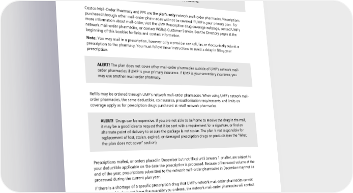 Mail-order pharmacies: Costco Mail-Order Pharmacy and Postal Prescription Services (PPS) ALERT! UMP’s network mail-order pharmacies cannot ship outside of the U.S. See “Travel overrides for prescription drugs” on page 101 if you will be traveling. Costco Mail-Order Pharmacy and PPS are the plan’s only network mail-order pharmacies. Prescriptions purchased through other mail-order pharmacies will not be covered if UMP is your primary plan. For more information about mail-order, visit the UMP Prescription drug coverage webpage, contact UMP’s network mail-order pharmacies, or contact WSRxS Customer Service. See the Directory pages at the beginning of this booklet for links and contact information. Note: You may mail in a prescription, however only a provider can call, fax, or electronically submit a prescription to the pharmacy. You must follow these instructions to avoid a delay in filling your prescription. ALERT! The plan does not cover other mail-order pharmacies outside of UMP’s network mail- order pharmacies if UMP is your primary insurance. If UMP is your secondary insurance, you may use another mail-order pharmacy. Refills may be ordered through UMP’s network mail-order pharmacies. When using UMP’s network mail- order pharmacies, the same deductible, coinsurance, preauthorization requirements, and limits on coverage apply as for prescription drugs purchased at retail network pharmacies. ALERT! Drugs can be expensive. If you are not able to be home to receive the drug in the mail, it may be a good idea to request that it be sent with a requirement for a signature, or find an alternate point of delivery to ensure the package is not stolen. The plan is not responsible for replacement of lost, stolen, expired, or damaged prescription drugs or products (see the “What the plan does not cover” section). Prescriptions mailed, or orders placed in December but not filled until January 1 or after, are subject to your deductible applicable on the date the prescription is processed. Because of increased volume at the end of the year, prescriptions submitted to the network mail-order pharmacies in December may not be processed during the current plan year. If there is a shortage of a specific prescription drug that UMP’s network mail-order pharmacies cannot control, and it does not have the quantity you ordered, the network mail-order pharmacies will contact you to discuss your options for obtaining your prescription(s). ALERT! Some Durable Medical Equipment (DME) items are not available through UMP’s network mail-order pharmacies. You will need to get them through a network retail pharmacy or preferred DME provider. 2024 UMP CDHP (PEBB) Certificate of Coverage 95