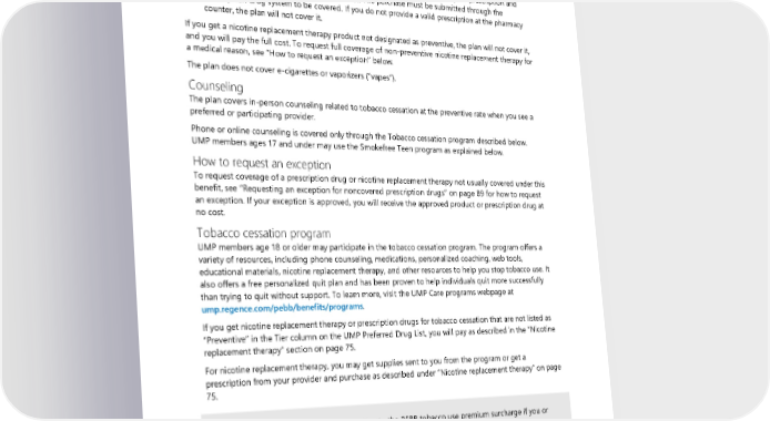 You may get nicotine replacement therapy directly from the tobacco cessation program (see the “Tobacco cessation program” section below), or by following these steps: 1. Get a prescription from your provider. 2. Take the prescription to a network pharmacy. 3. Make your purchase at the pharmacy counter of a network pharmacy. Give your prescription and your UMP member ID card to the pharmacist. The purchase must be submitted through the prescription drug system to be covered. If you do not provide a valid prescription at the pharmacy counter, the plan will not cover it. If you get a nicotine replacement therapy product not designated as preventive, the plan will not cover it, and you will pay the full cost. To request full coverage of non-preventive nicotine replacement therapy for a medical reason, see “How to request an exception” below. The plan does not cover e-cigarettes or vaporizers (“vapes”). Counseling The plan covers in-person counseling related to tobacco cessation at the preventive rate when you see a preferred or participating provider. Phone or online counseling is covered only through the Tobacco cessation program described below. UMP members ages 17 and under may use the Smokefree Teen program as explained below. How to request an exception To request coverage of a prescription drug or nicotine replacement therapy not usually covered under this benefit, see “Requesting an exception for noncovered prescription drugs” on page 89 for how to request an exception. If your exception is approved, you will receive the approved product or prescription drug at no cost. Tobacco cessation program UMP members age 18 or older may participate in the tobacco cessation program. The program offers a variety of resources, including phone counseling, medications, personalized coaching, web tools, educational materials, nicotine replacement therapy, and other resources to help you stop tobacco use. It also offers a free personalized quit plan and has been proven to help individuals quit more successfully than trying to quit without support. To learn more, visit the UMP Care programs webpage at ump.regence.com/pebb/benefits/programs. If you get nicotine replacement therapy or prescription drugs for tobacco cessation that are not listed as “Preventive” in the Tier column on the UMP Preferred Drug List, you will pay as described in the “Nicotine replacement therapy” section on page 75. For nicotine replacement therapy, you may get supplies sent to you from the program or get a prescription from your provider and purchase as described under “Nicotine replacement therapy” on page 75. ALERT! You may attest for an exemption to the PEBB tobacco use premium surcharge if you or a dependent are tobacco-free for two months, enroll in the tobacco cessation program (for members age 18 or older), or access the information and resources aimed at teens in Smokefree Teen (for members ages 13 through 17). Visit the HCA website at hca.wa.gov/erb for details about the surcharge. 76 2024 UMP CDHP (PEBB) Certificate of Coverage