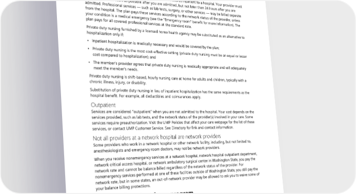 the difference in cost between the standard and higher-cost item (unless you agreed in writing to pay before receiving the services). If benefits change under the plan while you are in the hospital (or any other facility as an inpatient), coverage is based on the benefit in effect when the stay began. Inpatient Services are considered “inpatient” when you are admitted as inpatient to a hospital. Your provider must notify the plan as soon as possible after you are admitted, but not later than 24 hours after you are admitted. Professional services — such as lab tests, surgery, or other services — may be billed separate from the hospital. The plan pays these services according to the network status of the provider, unless your condition is a medical emergency (see the “Emergency room" benefit for more information). The plan pays for all covered professional services at the standard rate. Private duty nursing furnished by a licensed home health agency may be substituted as an alternative to hospitalization only if: • Inpatient hospitalization is medically necessary and would be covered by the plan; • Private duty nursing is the most cost-effective setting (private duty nursing must be an equal or lesser cost compared to hospitalization); and • The member's provider agrees that private duty nursing is medically appropriate and will adequately meet the member's needs. Private duty nursing is shift-based, hourly nursing care at home for adults and children, typically with a chronic illness, injury, or disability. Substitution of private duty nursing in lieu of inpatient hospitalization has the same requirements as the hospital benefit. For example, all deductibles and coinsurances apply. Outpatient Services are considered “outpatient” when you are not admitted to the hospital. Your cost depends on the services provided, such as lab tests, and the network status of the provider(s) involved in your care. Some services require preauthorization. Visit the UMP Policies that affect your care webpage for the list of these services, or contact UMP Customer Service. See Directory for link and contact information. Not all providers at a network hospital are network providers Some providers who work in a network hospital or other network facility, including, but not limited to, anesthesiologists and emergency room doctors, may not be network providers. When you receive nonemergency services at a network hospital, network hospital outpatient department, network critical access hospital, or network ambulatory surgical center in Washington State, you pay the network rate and cannot be balance billed regardless of the network status of the provider. For nonemergency services performed at one of these facilities outside of Washington State, you still pay the network rate, but in some states, an out-of-network provider may be allowed to ask you to waive some of your balance billing protections. Infusion drug site of care program The plan covers provider-administered infusion drugs when administered at an approved site of care. Approved sites of care include standalone infusion sites, doctor's offices, home infusion and some outpatient hospital facilities. Infusion drugs in the site of care program require preauthorization by the plan before services are performed, or services will not be covered. Your provider must submit a preauthorization request for an unapproved site of care. See the “Limits on plan coverage” section for preauthorization instructions. 2024 UMP CDHP (PEBB) Certificate of Coverage 57