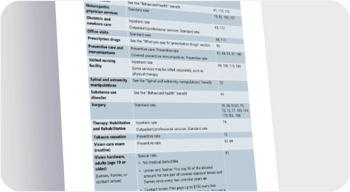 Benefit/service How much you will pay For information, see page(s): Hospital services Inpatient rate 56, 63, 109 Outpatient/professional services: Standard rate Mammograms Diagnostic: Standard rate 61 Screening: Preventive rate Mental health See the “Behavioral health” benefit 41, 110, 112 Naturopathic Standard rate 19, 62, 102, 107 physician services Obstetric and Inpatient rate 63, 112 newborn care Outpatient/professional services: Standard rate Office visits Standard rate 64, 111 Prescription drugs See the “What you pay for prescription drugs” section 90 Preventive care and Preventive care: Preventive rate 61, 64, 65, 91, 186 immunizations Covered preventive immunizations: Preventive rate Skilled nursing Inpatient rate 69, 109, 113, 190 facility Some services may be billed separately, such as physical therapy Spinal and extremity See the “Spinal and extremity manipulations” benefit 70 manipulations Substance use See the “Behavioral health” benefit 41 disorder Surgery Standard rate 56, 58, 62,65, 70, 70, 73, 77, 109, 114, 170,183 , 188 Therapy: Habilitative Inpatient rate 74 and Rehabilitative Outpatient/professional services: Standard rate Tobacco cessation Preventive rate 75 Vision care exam Preventive rate 81, 84 (routine) Vision hardware, Special rate: 81 adults (age 19 or • No medical deductible older) • Lenses and frames: You pay $0 of the allowed (Lenses, frames, or amount for one pair of covered standard lenses and contact lenses) frames once every two calendar years; or • Contact lenses: Plan pays up to $150 every two calendar years in lieu of lenses and frames. You pay a $30 fitting fee for contact lenses. 38 2024 UMP CDHP (PEBB) Certificate of Coverage