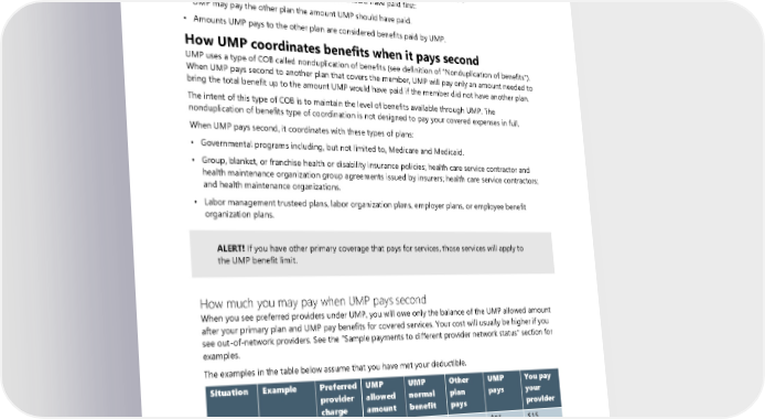 When UMP pays first When the plan is the primary payer (pays first), UMP pays its normal benefit as described in this COC. You may need to send UMP’s Explanation of Benefits and a copy of your provider’s bill to your secondary payer to receive payment. Check with that plan for more information. When UMP is supposed to pay first, but another plan did instead If another plan pays first on claims where UMP should have paid first: • UMP may pay the other plan the amount UMP should have paid. • Amounts UMP pays to the other plan are considered benefits paid by UMP. How UMP coordinates benefits when it pays second UMP uses a type of COB called nonduplication of benefits (see definition of “Nonduplication of benefits”). When UMP pays second to another plan that covers the member, UMP will pay only an amount needed to bring the total benefit up to the amount UMP would have paid if the member did not have another plan. The intent of this type of COB is to maintain the level of benefits available through UMP. The nonduplication of benefits type of coordination is not designed to pay your covered expenses in full. When UMP pays second, it coordinates with these types of plans: • Governmental programs including, but not limited to, Medicare and Medicaid. • Group, blanket, or franchise health or disability insurance policies; health care service contractor and health maintenance organization group agreements issued by insurers; health care service contractors; and health maintenance organizations. • Labor management trusteed plans, labor organization plans, employer plans, or employee benefit organization plans. ALERT! If you have other primary coverage that pays for services, those services will apply to the UMP benefit limit. How much you may pay when UMP pays second When you see preferred providers under UMP, you will owe only the balance of the UMP allowed amount after your primary plan and UMP pay benefits for covered services. Your cost will usually be higher if you see out-of-network providers. See the “Sample payments to different provider network status” section for examples. The examples in the table below assume that you have met your deductible. Situation Example Preferred UMP UMP Other UMP You pay provider allowed normal plan pays your charge amount benefit pays provider UMP is EXAMPLE 1: $200 $100 $85 N/A $85 $15 primary, When UMP (85% of other plan pays first (or $100) is is the only secondary plan) UMP is EXAMPLE 2: $200 $100 $85 $80 $5 $15 secondary, 2024 UMP CDHP (PEBB) Certificate of Coverage 119