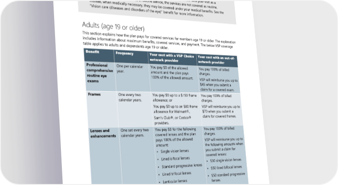 • Out-of-network provider: For members age 19 or older, out-of-network providers will cost you more. See the table below for more information. Members under age 19 do not have out-of-network benefits. ALERT! This benefit covers only services that meet the requirements below. If you receive services during a comprehensive routine eye exam and your provider bills your visit as a medical treatment instead of as a routine service, the services are not covered as routine. Instead, when medically necessary, they may be covered under your medical benefits. See the “Vision care (diseases and disorders of the eye)” benefit for more information. Adults (age 19 or older) This section explains how the plan pays for covered services for members age 19 or older. The explanation includes information about maximum benefits, covered services, and payment. The below VSP coverage table applies to adults and dependents age 19 or older. Benefit Frequency Your cost with a VSP Choice Your cost with an out-of- network provider network provider Professional One per calendar You pay $0 of the allowed You pay 100% of billed comprehensive year. amount and the plan pays charges. routine eye 100% of the allowed amount. VSP will reimburse you up to exams $45 when you submit a claim for a covered exam. Frames One every two You pay $0 up to a $150 frame You pay 100% of billed calendar years. allowance; or charges. You pay $0 up to an $80 frame VSP will reimburse you up to allowance for Walmart®, $70 when you submit a claim for covered frames. Sam’s Club®, or Costco® providers. Lenses and One set every two You pay $0 for the following You pay 100% of billed enhancements calendar years. covered lenses and the plan charges. pays 100% of the allowed VSP will reimburse you up to amount: the following amounts when • Single vision lenses you submit a claim for • Lined bifocal lenses covered lenses: • Standard progressive lenses • $30 single vision lenses • Lined trifocal lenses • $50 lined bifocal lenses • Lenticular lenses • $50 standard progressive lenses Note: Lens enhancement is not • $65 lined trifocal lenses covered except for impact- • $100 lenticular lenses resistant coating for dependent children age 19 or older. 80 2024 UMP CDHP (PEBB) Certificate of Coverage
