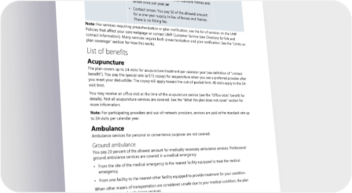 Benefit/service How much you will pay For information, see page(s): Vision hardware, Special rate: 85 children (under age • No medical deductible. 19) • Lenses and frames: You pay $0 of the allowed (Lenses, frames, or amount for one pair of covered standard frames and contact lenses) lenses once per year; or • Contact lenses: You pay $0 of the allowed amount for a one-year supply in lieu of lenses and frames. There is no fitting fee. Note: For services requiring preauthorization or plan notification, see the list of services on the UMP Policies that affect your care webpage or contact UMP Customer Service (see Directory for link and contact information). Many services require both preauthorization and plan notification. See the “Limits on plan coverage” section for how this works. List of benefits Acupuncture The plan covers up to 24 visits for acupuncture treatment per calendar year (see definition of “Limited benefit”). You pay the special rate (a $15 copay) for acupuncture when you see a preferred provider after you meet your deductible. The copay will apply toward the out-of-pocket limit. All visits apply to the 24- visit limit. You may receive an office visit at the time of the acupuncture service (see the “Office visits” benefit for details). Not all acupuncture services are covered. See the “What the plan does not cover” section for more information. Note: For participating providers and out-of-network providers, services are paid at the standard rate up to 24 visits per calendar year. Ambulance Ambulance services for personal or convenience purposes are not covered. Ground ambulance You pay 20 percent of the allowed amount for medically necessary ambulance services. Professional ground ambulance services are covered in a medical emergency: • From the site of the medical emergency to the nearest facility equipped to treat the medical emergency. • From one facility to the nearest other facility equipped to provide treatment for your condition. When other means of transportation are considered unsafe due to your medical condition, the plan covers professional ambulance services: • From one facility to another facility, for inpatient or outpatient treatment; • From home to a facility; or • From a facility to home. 2024 UMP CDHP (PEBB) Certificate of Coverage 39