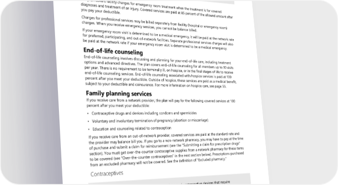 Emergency room TIP: If you need immediate care but your situation is not a medical emergency, see the “Urgent care” benefit for how to get treatment at a lower cost than in an emergency room. The plan covers facility charges for emergency room treatment when the treatment is for covered diagnoses and treatment of an injury. Covered services are paid at 85 percent of the allowed amount after you pay your deductible. Charges for professional services may be billed separately from facility (hospital or emergency room) charges. When you receive emergency services, you cannot be balance billed. If your emergency room visit is determined to be a medical emergency, it will be paid at the network rate for preferred, participating, and out-of-network facilities. Separate professional services charges will also be paid at the network rate if your emergency room visit is determined to be a medical emergency. End-of-life counseling End-of-life counseling involves discussing and planning for your end-of-life care, including treatment options and advanced directives. The plan covers end-of-life counseling for all members up to 30 visits per year. There is no requirement to be terminally ill, on hospice, or in the final stages of life to receive end-of-life counseling services. End-of-life counseling associated with hospice services is paid at 100 percent after you meet your deductible. Outside of hospice, these services are paid as a medical benefit, subject to your deductible and coinsurance. For more information on hospice care, see page 55. Family planning services If you receive care from a network provider, the plan will pay for the following covered services at 100 percent after you meet your deductible: • Contraceptive drugs and devices including condoms and spermicides • Voluntary and involuntary termination of pregnancy (abortion or miscarriage) • Education and counseling related to contraception If you receive care from an out-of-network provider, covered services are paid at the standard rate and the provider may balance bill you. If you go to a non-network pharmacy, you may have to pay at the time of purchase and submit a claim for reimbursement (see the "Submitting a claim for prescription drugs" section). You must get over-the-counter contraceptive supplies from a network pharmacy for these items to be covered (see “Over-the-counter contraceptives” in the next section below). Prescriptions purchased from an excluded pharmacy will not be covered. See the definition of “Excluded pharmacy.” Contraceptives ALERT! Visits for placement and removal of covered contraceptive devices that require professional insertion and removal are covered at the preventive rate. Contraceptives are covered under the prescription drug benefit. Contraceptives include, but are not limited to, birth control pills, emergency contraception (the “morning after” pill), vaginal rings, patches, 2024 UMP CDHP (PEBB) Certificate of Coverage 51