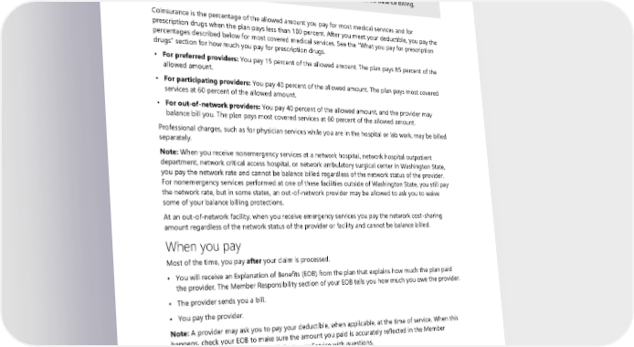 Coinsurance TIP: Allowed amount is the most the plan pays for a specific covered service or supply. Out-of- network providers may charge more than this amount, and you are responsible for paying the difference between the billed amount and the allowed amount. This is called balance billing. Coinsurance is the percentage of the allowed amount you pay for most medical services and for prescription drugs when the plan pays less than 100 percent. After you meet your deductible, you pay the percentages described below for most covered medical services. See the “What you pay for prescription drugs” section for how much you pay for prescription drugs. • For preferred providers: You pay 15 percent of the allowed amount. The plan pays 85 percent of the allowed amount. • For participating providers: You pay 40 percent of the allowed amount. The plan pays most covered services at 60 percent of the allowed amount. • For out-of-network providers: You pay 40 percent of the allowed amount, and the provider may balance bill you. The plan pays most covered services at 60 percent of the allowed amount. Professional charges, such as for physician services while you are in the hospital or lab work, may be billed separately. Note: When you receive nonemergency services at a network hospital, network hospital outpatient department, network critical access hospital, or network ambulatory surgical center in Washington State, you pay the network rate and cannot be balance billed regardless of the network status of the provider. For nonemergency services performed at one of these facilities outside of Washington State, you still pay the network rate, but in some states, an out-of-network provider may be allowed to ask you to waive some of your balance billing protections. At an out-of-network facility, when you receive emergency services you pay the network cost-sharing amount regardless of the network status of the provider or facility and cannot be balance billed. When you pay Most of the time, you pay after your claim is processed. • You will receive an Explanation of Benefits (EOB) from the plan that explains how much the plan paid the provider. The Member Responsibility section of your EOB tells you how much you owe the provider. • The provider sends you a bill. • You pay the provider. Note: A provider may ask you to pay your deductible, when applicable, at the time of service. When this happens, check your EOB to make sure the amount you paid is accurately reflected in the Member Responsibility section. Contact UMP Customer Service with questions. Health savings account (HSA) The State of Washington will contribute $700.08 for one person, and $1,400.04 for more than one person enrolled in the plan, deposited in equal amounts over the calendar year. Employer contributions are made only during those months you are enrolled in UMP CDHP. You may also make contributions to your HSA account. To confirm the maximum annual contribution limits, visit the IRS website at irs.gov/government- entities/federal-state-local-governments/where-can-i-learn-more-about-health-savings-accounts-hsa- 2024 UMP CDHP (PEBB) Certificate of Coverage 27