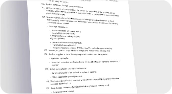◦ For which you are not obligated to pay ◦ Provided by a resident physician or intern acting in that capacity ◦ Provided by someone in the member’s family or household ◦ That are not medically necessary for the diagnosis and treatment of injury or illness or restoration of physiological functions and are not covered as preventive care. This applies even if services are prescribed, recommended, or approved by your provider. ◦ That are solely for comfort 102. Services performed during a noncovered service 103. Services performed primarily to ensure the success of a noncovered service, including, but not limited to, a hiatal hernia repair done to ensure the success of a noncovered laparoscopic adjustable gastric banding surgery 104. Services supplemental to digital mammography. When performed supplementary to digital mammography for screening purposes for members with or without dense breasts, the following procedures are not covered: ◦ Non-high-risk patients: • Automated Breast Ultrasound (ABUS) • Handheld Ultrasound (HHUS) • Magnetic Resonance Imaging (MRI) ◦ High-risk patients: • Automated breast ultrasound (ABUS) • Handheld Ultrasound (HHUS) • Magnetic Resonance Imaging (MRI) less than 11 months after a prior screening 105. Services, supplies, or drugs related to occupational injury or illness (see page 130) 106. Services, supplies, or items that require preauthorization unless the request is: ◦ Approved by the plan ◦ Supported by medical justification from a clinician other than the member or the family of a member 107. Skilled nursing facility services or confinement: ◦ When primary use of the facility is as a place of residence ◦ When treatment is primarily custodial 108. Sleep apnea diagnosis and treatment as indicated in referenced Medicare national and local coverage determinations 109. Sleep therapy services performed at the following locations are not covered: ◦ Emergency room services ◦ Inpatient hospitalization ◦ Urgent-care facilities 110. Sound therapies for treatment of tinnitus, including, but not limited to: ◦ Masking devices (sound maskers) ◦ Altered auditory stimuli ◦ Auditory attention training 2024 UMP CDHP (PEBB) Certificate of Coverage 113