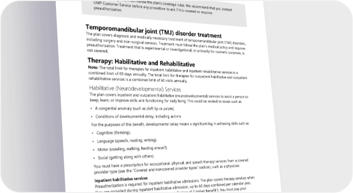 The plan covers the following services as outpatient: • Outpatient surgery at a hospital • Short-stay obstetric (childbirth) services (released within 24 hours of admission) • Surgery and procedures performed at an ambulatory surgery center ALERT! All surgeries must follow the plan’s coverage rules. We recommend that you contact UMP Customer Service before any procedure to ask if it is covered or requires preauthorization. Temporomandibular joint (TMJ) disorder treatment The plan covers diagnosis and medically necessary treatment of temporomandibular joint (TMJ) disorders, including surgery and non-surgical services. Treatment must follow the plan’s medical policy and requires preauthorization. Treatment that is experimental or investigational, or primarily for cosmetic purposes, is not covered. Therapy: Habilitative and Rehabilitative Note: The total limit for therapies for inpatient habilitative and inpatient rehabilitative services is a combined limit of 60 days annually. The total limit for therapies for outpatient habilitative and outpatient rehabilitative services is a combined limit of 60 visits annually. Habilitative (Neurodevelopmental) Services The plan covers inpatient and outpatient habilitative (neurodevelopmental) services to assist a person to keep, learn, or improve skills and functioning for daily living. This could be related to issues such as: • A congenital anomaly (such as cleft lip or palate). • Conditions of developmental delay, including autism. For the purposes of this benefit, developmental delay means a significant lag in achieving skills such as: • Cognitive (thinking). • Language (speech, reading, writing). • Motor (crawling, walking, feeding oneself). • Social (getting along with others). You must have a prescription for occupational, physical, and speech therapy services from a covered provider type (see the “Covered and noncovered provider types” section), such as a physician. Inpatient habilitative services Preauthorization is required for inpatient habilitative admissions. The plan covers therapy services when they are provided during inpatient habilitative admission, up to 60 days combined per calendar year, counting all types of therapies listed here (see definition of “Limited benefit”). You must pay your coinsurance for inpatient services. Outpatient habilitative services The plan covers medically necessary outpatient occupational, physical, and speech therapy services up to 60 visits combined per calendar year, counting all types of therapies listed here (see definition of “Limited benefit”). 74 2024 UMP CDHP (PEBB) Certificate of Coverage