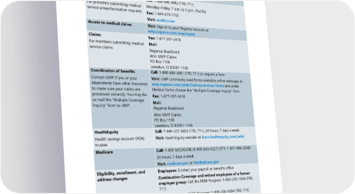 Contact type and description Contact information Mail: UMP Appeals and Grievances Regence BlueShield PO Box 1106 Lewiston, ID 83501-1106 Preauthorization Call: 1-888-849-3682 (TRS: 711) For providers submitting medical Monday–Friday: 7 a.m. to 5 p.m. (Pacific) service preauthorization requests Fax: 1-844-679-7763 Visit: availity.com Access to medical claims Visit: Sign in to your Regence account at ump.regence.com/ump/signin Claims Fax: 1-877-357-3418 For members submitting medical Mail: service claims Regence BlueShield Attn: UMP Claims PO Box 1106 Lewiston, ID 83501-1106 Coordination of benefits Call: 1-888-849-3681 (TRS: 711) to request a form Contact UMP if you or your Visit: UMP commonly used forms available online webpage at dependents have other insurance ump.regence.com/pebb/forms/common-forms and under to make sure your claims are Medical forms choose the “Multiple Coverage Inquiry” form processed correctly. You may fax Fax: 1-877-357-3418 or mail the “Multiple Coverage Mail: Inquiry” form to UMP. Regence BlueShield Attn: UMP Claims PO Box 1106 Lewiston, ID 83501-1106 HealthEquity Call: 1-844-351-6853 (TRS: 711), 24 hours, 7 days a week Health savings account (HSA) Visit: HealthEquity website at learn.healthequity.com/pebb trustee Medicare Call: 1-800-MEDICARE (1-800-633-4227) (TTY: 1-877-486-2048) 24 hours, 7 days a week Visit: medicare.gov or MyMedicare.gov Eligibility, enrollment, and Employees: Contact your payroll or benefits office address changes Continuation Coverage and retired employees of a former employer group: Call the PEBB Program: 1-800-200-1004 (TRS: 711) Retirees: Call the PEBB Program: 1-800-200-1004 (TRS: 711) Monday–Friday: 8 a.m. to 4:30 p.m. (Pacific) Visit: hca.wa.gov/erb 2 2024 UMP CDHP (PEBB) Certificate of Coverage