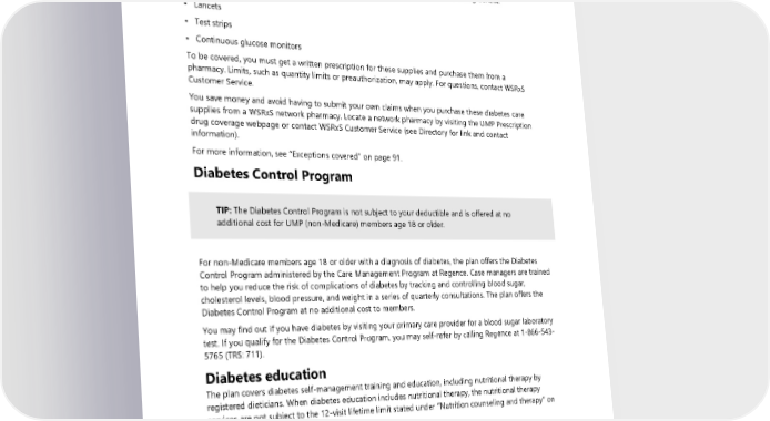 Medical Insulin pumps and pump supplies are covered as durable medical equipment (DME). See page 50 for coverage of insulin pumps and related supplies. Prescription drug Diabetes care supplies listed below are only covered under your plan’s prescription drug benefit: • Insulin syringes • Lancets • Test strips • Continuous glucose monitors To be covered, you must get a written prescription for these supplies and purchase them from a pharmacy. Limits, such as quantity limits or preauthorization, may apply. For questions, contact WSRxS Customer Service. You save money and avoid having to submit your own claims when you purchase these diabetes care supplies from a WSRxS network pharmacy. Locate a network pharmacy by visiting the UMP Prescription drug coverage webpage or contact WSRxS Customer Service (see Directory for link and contact information). For more information, see “Exceptions covered" on page 91. Diabetes Control Program TIP: The Diabetes Control Program is not subject to your deductible and is offered at no additional cost for UMP (non-Medicare) members age 18 or older. For non-Medicare members age 18 or older with a diagnosis of diabetes, the plan offers the Diabetes Control Program administered by the Care Management Program at Regence. Case managers are trained to help you reduce the risk of complications of diabetes by tracking and controlling blood sugar, cholesterol levels, blood pressure, and weight in a series of quarterly consultations. The plan offers the Diabetes Control Program at no additional cost to members. You may find out if you have diabetes by visiting your primary care provider for a blood sugar laboratory test. If you qualify for the Diabetes Control Program, you may self-refer by calling Regence at 1-866-543- 5765 (TRS: 711). Diabetes education The plan covers diabetes self-management training and education, including nutritional therapy by registered dieticians. When diabetes education includes nutritional therapy, the nutritional therapy services are not subject to the 12-visit lifetime limit stated under “Nutrition counseling and therapy” on page 62. Diabetes Prevention Program (DPP) You may be eligible for DPP if: • You are not a Medicare member; • You are age 18 and older; 2024 UMP CDHP (PEBB) Certificate of Coverage 47
