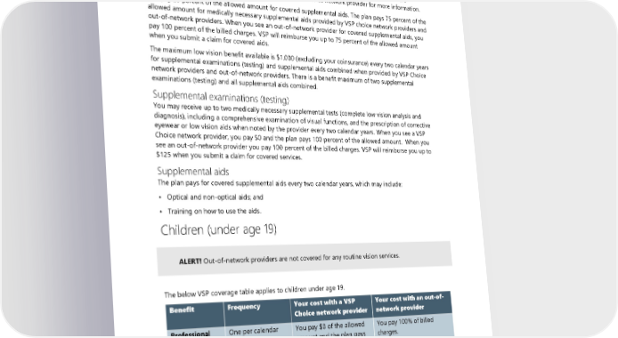 • $150 necessary contact lenses including any fitting/evaluation services Low vision benefit The plan covers low vision benefits when vision loss is sufficient enough to prevent reading and performing daily activities with standard corrective eyewear. If you fall within this category, you are entitled to professional services, as well as ophthalmic materials. These services and equipment are subject to the limitations stated below. Contact your VSP Choice network provider for more information. You pay 25 percent of the allowed amount for covered supplemental aids. The plan pays 75 percent of the allowed amount for medically necessary supplemental aids provided by VSP choice network providers and out-of-network providers. When you see an out-of-network provider for covered supplemental aids, you pay 100 percent of the billed charges. VSP will reimburse you up to 75 percent of the allowed amount when you submit a claim for covered aids. The maximum low vision benefit available is $1,000 (excluding your coinsurance) every two calendar years for supplemental examinations (testing) and supplemental aids combined when provided by VSP Choice network providers and out-of-network providers. There is a benefit maximum of two supplemental examinations (testing) and all supplemental aids combined. Supplemental examinations (testing) You may receive up to two medically necessary supplemental tests (complete low vision analysis and diagnosis), including a comprehensive examination of visual functions, and the prescription of corrective eyewear or low vision aids when noted by the provider every two calendar years. When you see a VSP Choice network provider, you pay $0 and the plan pays 100 percent of the allowed amount. When you see an out-of-network provider you pay 100 percent of the billed charges. VSP will reimburse you up to $125 when you submit a claim for covered services. Supplemental aids The plan pays for covered supplemental aids every two calendar years, which may include: • Optical and non-optical aids; and • Training on how to use the aids. Children (under age 19) ALERT! Out-of-network providers are not covered for any routine vision services. The below VSP coverage table applies to children under age 19. Benefit Frequency Your cost with a VSP Your cost with an out-of- Choice network provider network provider Professional One per calendar You pay $0 of the allowed You pay 100% of billed comprehensive year. amount and the plan pays charges. routine eye 100% of the allowed exams amount. Frames One per calendar You pay $0 of the allowed You pay 100% of billed year. amount and the plan pays charges. 100% of the allowed amount. 2024 UMP CDHP (PEBB) Certificate of Coverage 83