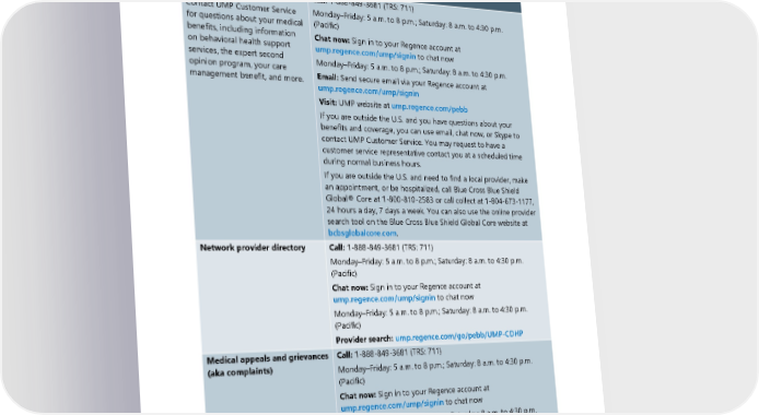 2024 UMP CDHP (PEBB) Certificate of Coverage Directory Directory: medical services Contact type and description Contact information UMP Customer Service Call: 1-888-849-3681 (TRS: 711) Contact UMP Customer Service Monday–Friday: 5 a.m. to 8 p.m.; Saturday: 8 a.m. to 4:30 p.m. for questions about your medical (Pacific) benefits, including information Chat now: Sign in to your Regence account at on behavioral health support ump.regence.com/ump/signin to chat now services, the expert second Monday–Friday: 5 a.m. to 8 p.m.; Saturday: 8 a.m. to 4:30 p.m. opinion program, your care Email: Send secure email via your Regence account at management benefit, and more. ump.regence.com/ump/signin Visit: UMP website at ump.regence.com/pebb If you are outside the U.S. and you have questions about your benefits and coverage, you can use email, chat now, or Skype to contact UMP Customer Service. You may request to have a customer service representative contact you at a scheduled time during normal business hours. If you are outside the U.S. and need to find a local provider, make an appointment, or be hospitalized, call Blue Cross Blue Shield Global® Core at 1-800-810-2583 or call collect at 1-804-673-1177, 24 hours a day, 7 days a week. You can also use the online provider search tool on the Blue Cross Blue Shield Global Core website at bcbsglobalcore.com. Network provider directory Call: 1-888-849-3681 (TRS: 711) Monday–Friday: 5 a.m. to 8 p.m.; Saturday: 8 a.m. to 4:30 p.m. (Pacific) Chat now: Sign in to your Regence account at ump.regence.com/ump/signin to chat now Monday–Friday: 5 a.m. to 8 p.m.; Saturday: 8 a.m. to 4:30 p.m. (Pacific) Provider search: ump.regence.com/go/pebb/UMP-CDHP Medical appeals and grievances Call: 1-888-849-3681 (TRS: 711) (aka complaints) Monday–Friday: 5 a.m. to 8 p.m.; Saturday: 8 a.m. to 4:30 p.m. (Pacific) Chat now: Sign in to your Regence account at ump.regence.com/ump/signin to chat now Monday–Friday: 5 a.m. to 8 p.m.; Saturday: 8 a.m. to 4:30 p.m. (Pacific) Fax: 1-877-663-7526 Online: Sign in to your secure Regence account at ump.regence.com/ump/signin. Go to Appeals to appeal online. Email: [email protected] 2024 UMP CDHP (PEBB) Certificate of Coverage 1